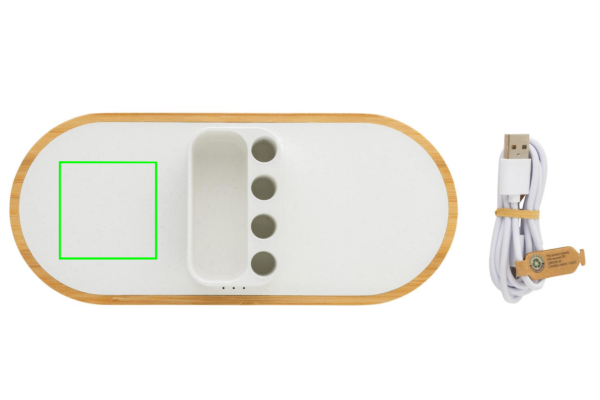 10W langaton pikalaturi kynäpidikkeellä valmistettuna RCS (Recycled Claim Standard) sertifioidusta kierrätetystä ABS:stä. Kierrätetyn materiaalin kokonaismäärä: 31% perustuen tuotteen painoon. RCS sertifiointi varmistaa kierrätettyjen materiaalien täysin sertifioidun toimitusketjun. Pohja on valmistettu FSC®100% bambusta. Langaton lataus yhteensopiva Androidin uusimpien sukupolvien, iPhone 8 ja uudempien, kanssa. Samaan aikaan voidaan ladata kahta puhelinta. 4 kynäreikää kynien säilytykseen sekä tilaa käyntikorteille tai muille pienille tavaroille. Tuote ja lisätarvikkeet PVC-vapaita. Sisältää 120cm tyypin C latauskaapelin, joka on valmistettu RCS sertifioidusta kierrätetystä TPE:stä. Pakattu FSC®-sekoituksesta valmistettuun kraft-pakkaukseen. Tyypin C tulovirta:5V/2A; 9V/2A; langaton ulostulo: 5V/1A; 9V/1.1A; (10W) Rekisteröity design®
