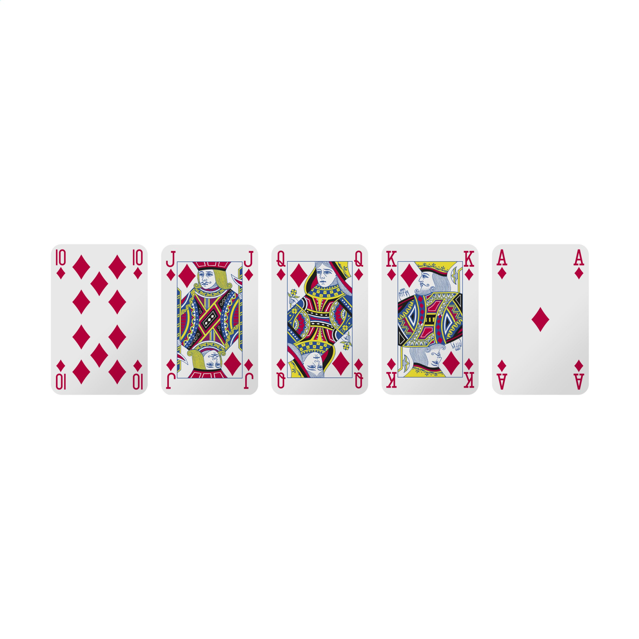 Pelikortit on valmistettu tukevasta 300 gramman pahvista. Nämä pakat koostuvat 52 pelikortista ja 2 jokerista. Pakattu sellofaanilla varustettuun pahvilaatikkoon. Voit lisätä värillisen suunnittelusi korttien takapuolelle ja myös laatikkoon, jolloin voit luoda ainutlaatuisen, henkilökohtaisen korttipakan, joka mainostaa brändiäsi jokaisessa pelissä.