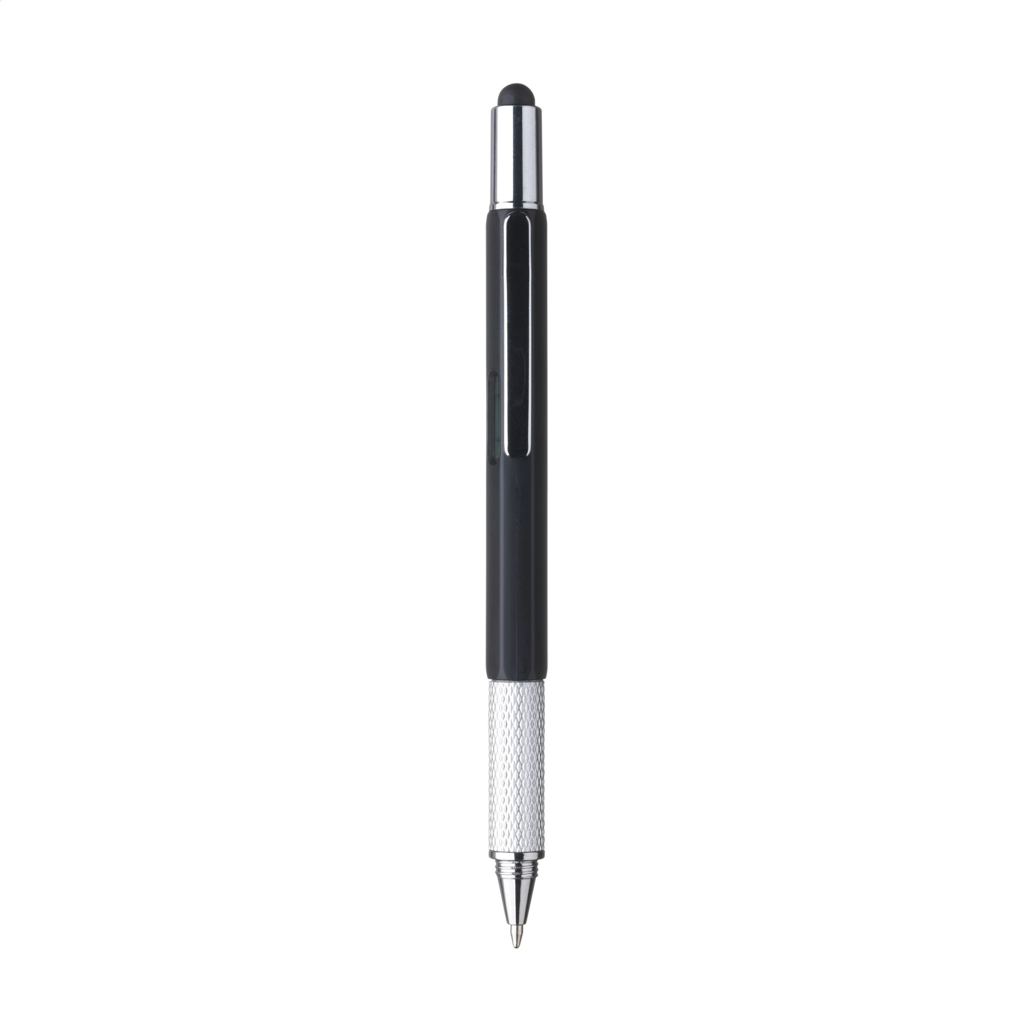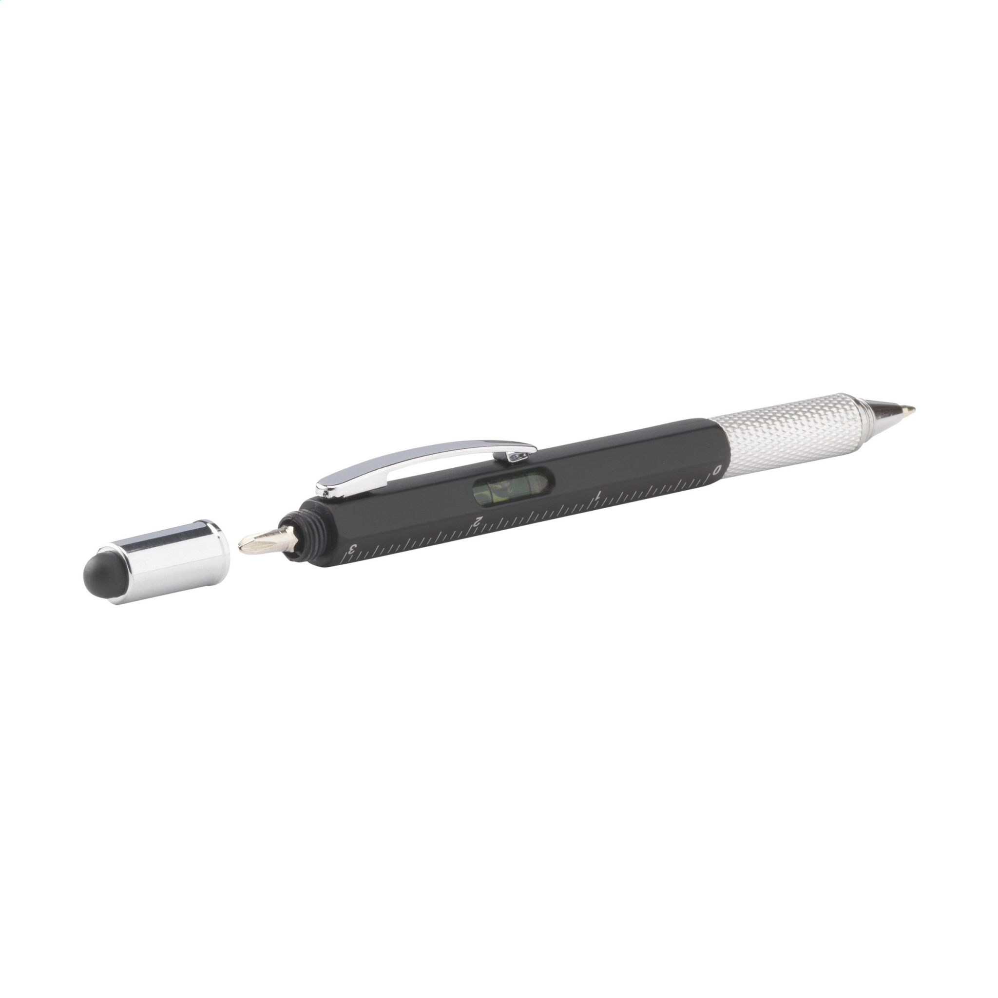 Monitoiminen kuulakärkikynä ABS-materiaalista. Viivain (7 cm/3 tuumaa), vesivaaka, ruuvimeisseli ja kynätoiminto. Kynässä on sininen muste, metalliklipsi ja kierremekanismi.