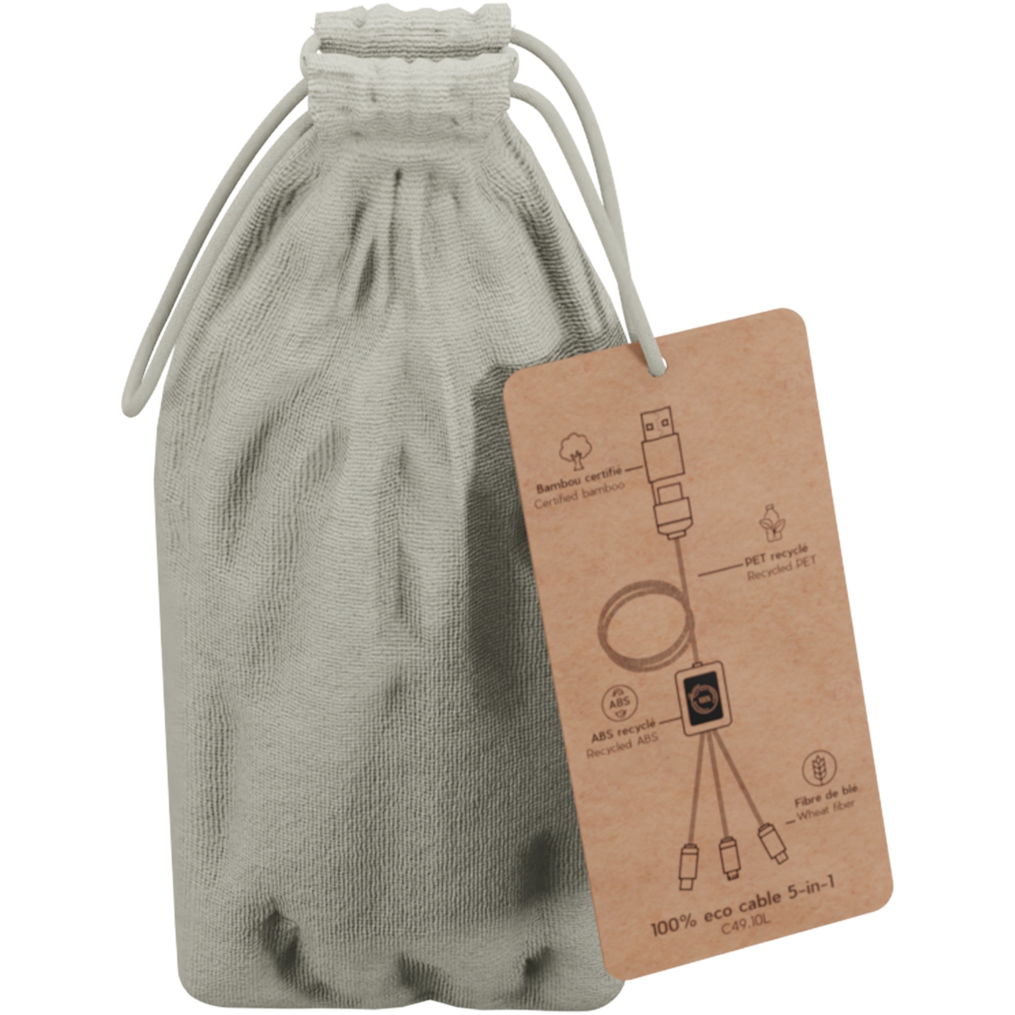 Nopea 2.4A-latauskaapeli (3 x 10 cm), johon voidaan lisätä yksilöllinen valaistu logo molemmille puolille. Logot voivat myös olla keskenään erilaisia. Kaapeli on valmistettu kokonaan ympäristöystävällisemmistä materiaaleista: RPET-johto, muut materiaalit bambu, vehnäkuitu ja kierrätetty muovi. Kolmen liitännän ansiosta latauskaapeli on universaali (Type-C, Android, iPhone), ja sillä voidaan ladata jopa kolme laitetta samanaikaisesti. Koska latauskaapelissa on USB- ja USB-C-kaksoiskytkentä, se on yhteensopiva uusimpien laitteiden kanssa. Toimitetaan puuvillapussissa (20 x 8 cm), ja mukana tulee voimapaperikortti.