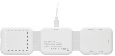 "Magneettinen latausasema ABS-muovista. 3 langatonta latauspistettä. 1 x 15 W, 1 x 5 W TWS:lle ja 1 Apple Watch -laturi (3 W). 2 Type-C- ja 2 USB-A-keskitintä. Liitin Type-C:stä USB-A;han."