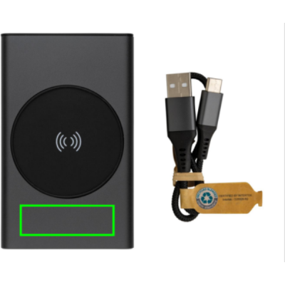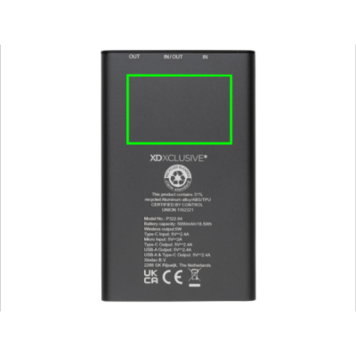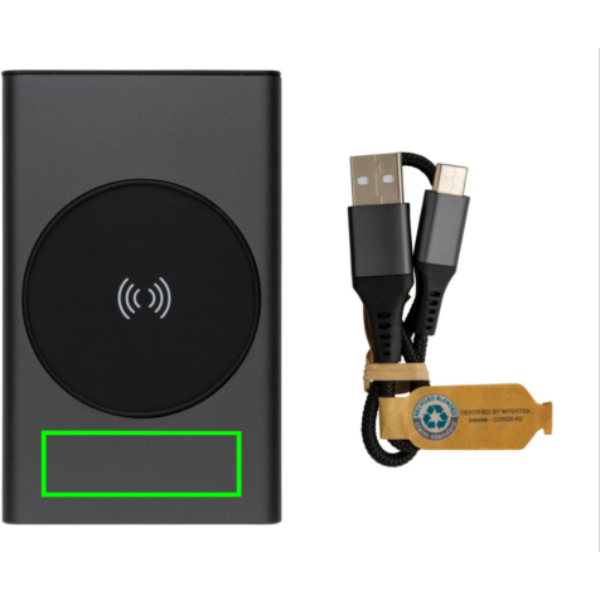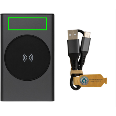 Varavirtalähde valmistettuna RCS (Recycled Claim Standard) sertifioidusta kierrätetystä alumiinista ja ABS:stä. Kierrätetyn materiaalin kokonaismäärä: 31% perustuen tuotteen painoon. RCS sertifiointi varmistaa kierrätettyjen materiaalien täysin sertifioidun toimitusketjun. Alumiini ei menetä ominaisuuksiaan kierrätysprosessissa, ja sitä voidaan kierrättää loputtomasti. Varavirtalähteessä on pitkäkestoinen A-luokan 5000 mAh litiumpolymeeriakku. Langaton laturi tukee latausta 5W asti. Virran merkkivalot kertovat, milloin on aika ladata tuote uudelleen. Tuote ja lisätarvikkeet 100% PVC-vapaita. Sisältää tyypin C latauskaapelin, joka on valmistettu RCS sertifioidusta kierrätetystä alumiinista, TPE:stä ja PET-materiaalista. Pakattu FSC® sekoituksesta valmistettuun pakkaukseen. USB lähtövirta: 5/2.4A, tyypin C lähtövirta: 5V/2.4A. Tyypin C tulovirta: 2.4A. Mikro USB tulovirta: 5V/2A.