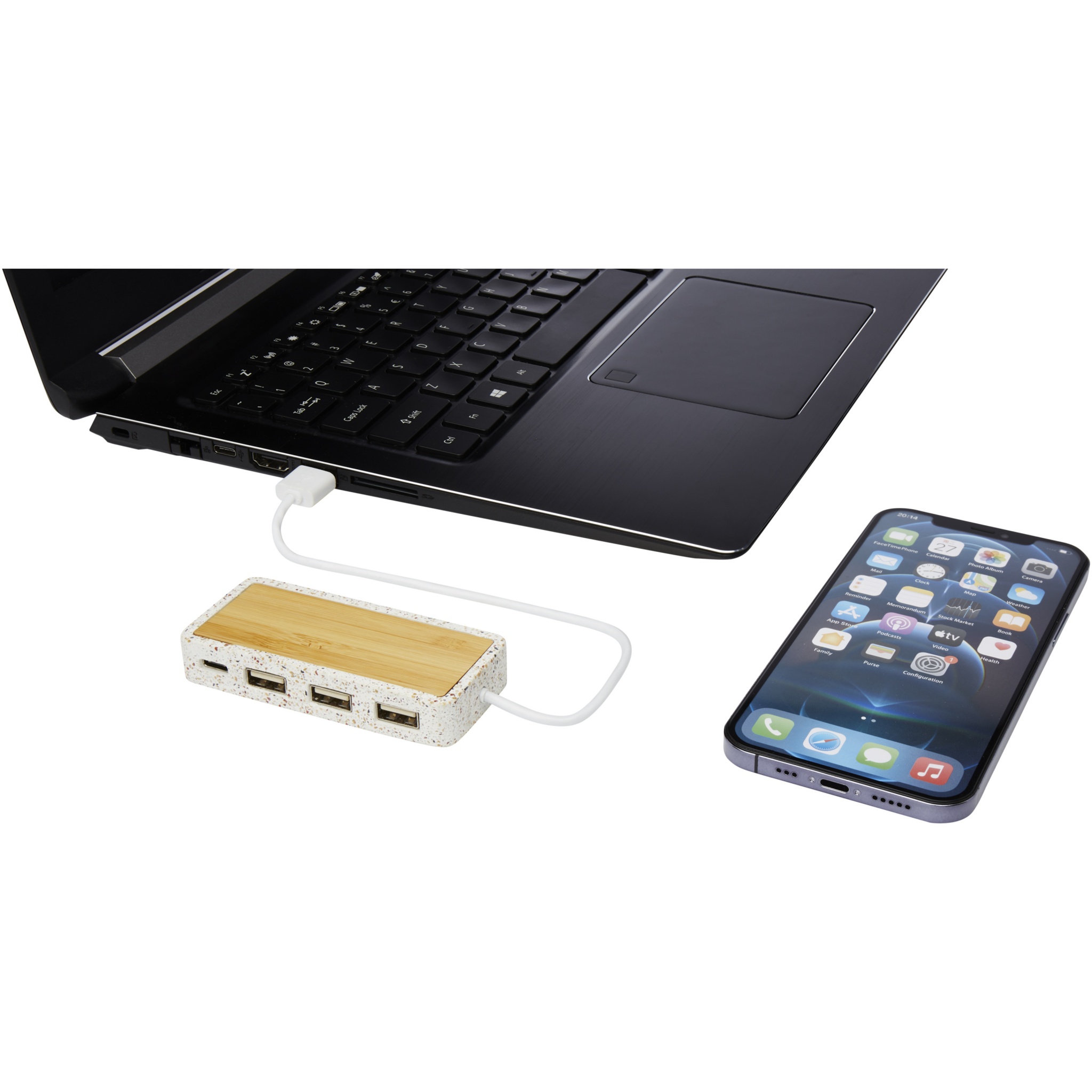 USB 2.0 -hubi, joka on valmistettu luonnonvärisestä mosaiikista ja bambusta. Sisältää 1:n Type-C-ulostulon ja 3 USB-A-ulostuloa. Toimitetaan lahjapakkauksessa, joka sisältää käyttöohjeet (molemmat kestävistä materiaaleista).
