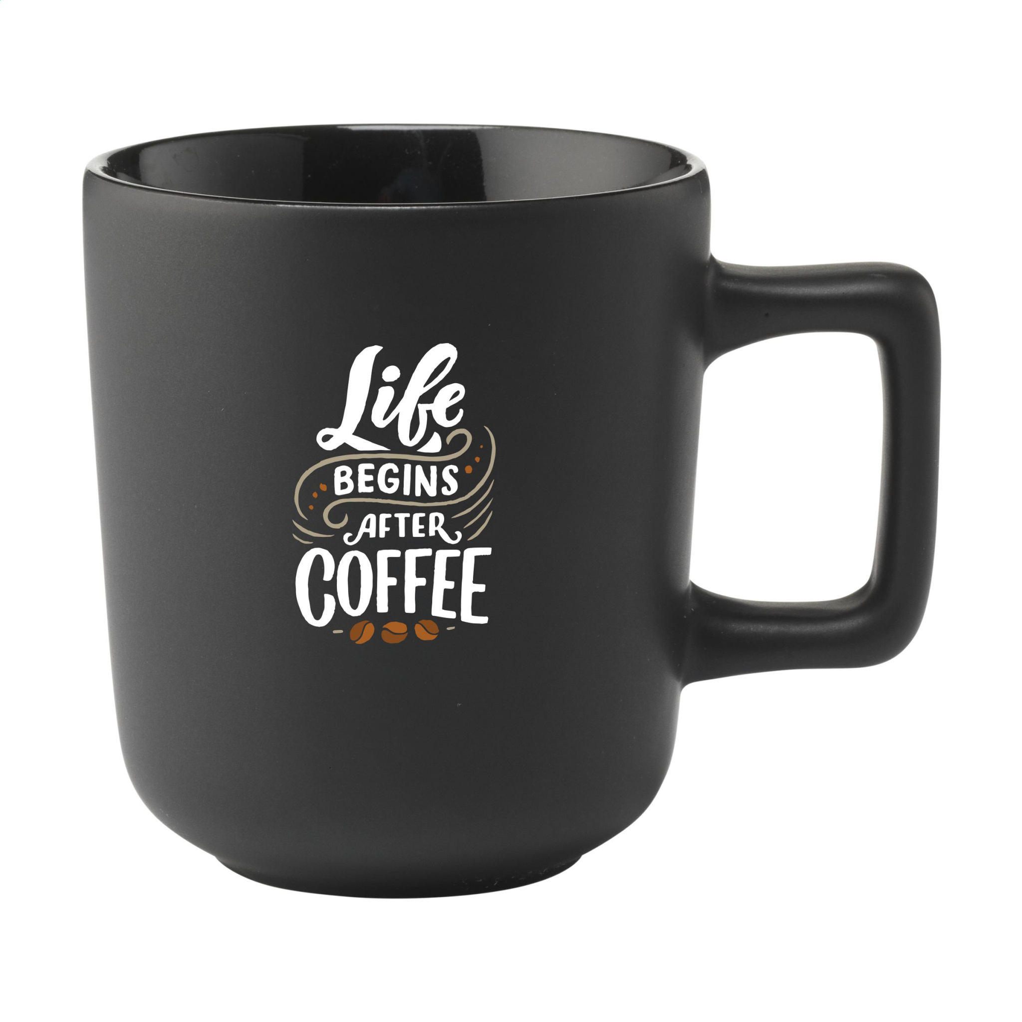 Laadukas keraaminen muki silmiinpistävällä kahvalla. Viimeistelty mattapintaisella ulkopinnalla ja korkeakiiltoisella sisustuksella. Astianpesukoneen kestävä. Jälki on testattu ja sertifioitu astianpesukoneen kestäväksi: EN 12875-2. Tilavuus 280 ml. HUOMAA: Valkoiseen mukiin ei voi laserkaivertaa, koska se ei ole riittävästi näkyvissä.