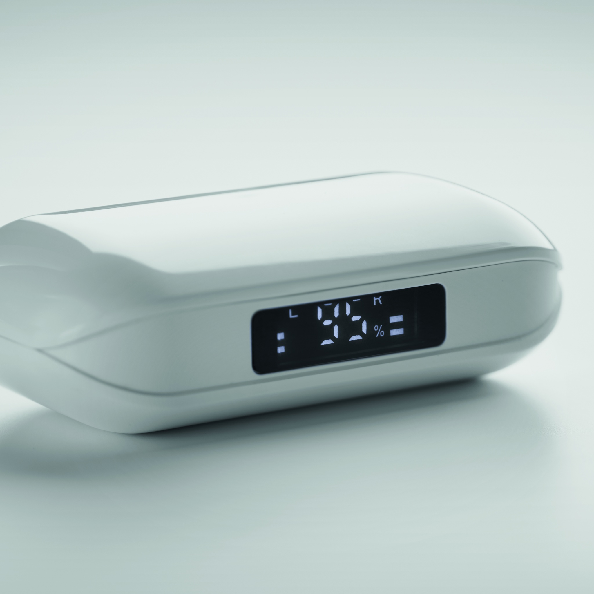 Kierrätettystä ABS-muovista valmistetut True Wireless Stereo (TWS) 5.3 langattomat stereokuulokkeet, joissa on mikrofoni ja sisäänrakennettu 25 mAh akku. Kuulokkeissa on varaustason LCD-näyttö. Automaattinen pariliitos. Mukana C-tyypin latauskaapeli ja 250 mAh latausasema.