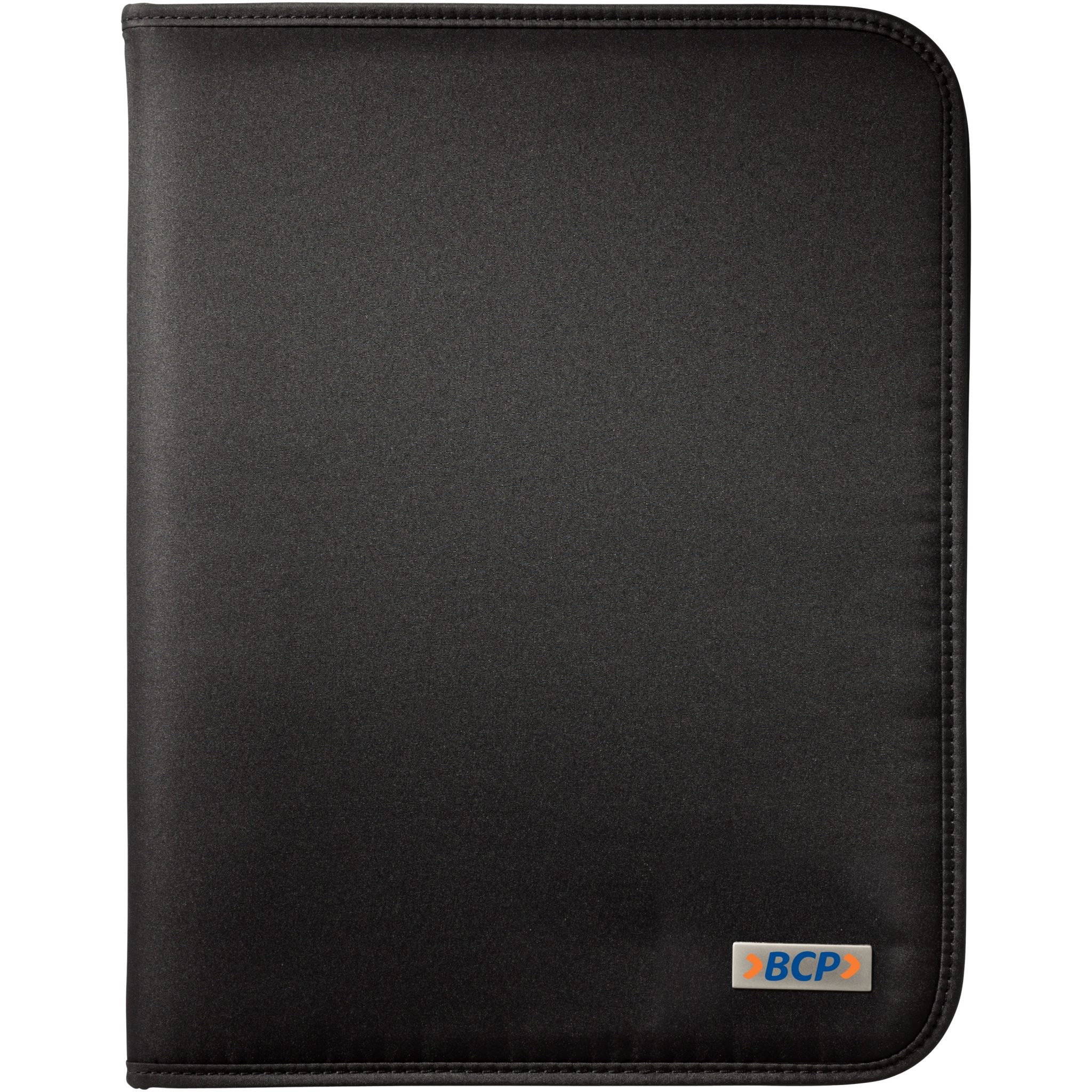 Kansiossa on vetoketju, kynälenkki, asiakirjataskut ja 20 viivoitettua muistipaperia. Kynä ja tarvikkeet rekvisiittaa.
