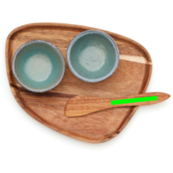 Kaunis tarjoilusetti, johon kuuluu kaksi keraamista kulhoa ja puinen tarjoiluvati. Sopii mainiosti aamiaisen, lisukkeiden, tapasten ja jälkiruokien tarjoiluun.