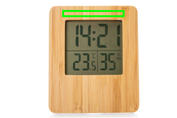 Bambukinė oro stotis su 3 funkcijomis: laikas/data, patalpų drėgmė ir temperatūra. Su 2 AAA tipo baterijomis, skirtomis tiesioginiam naudojimui. Bambuko ir ABS medžiaga. Drėgmės tolerancija max 5%.