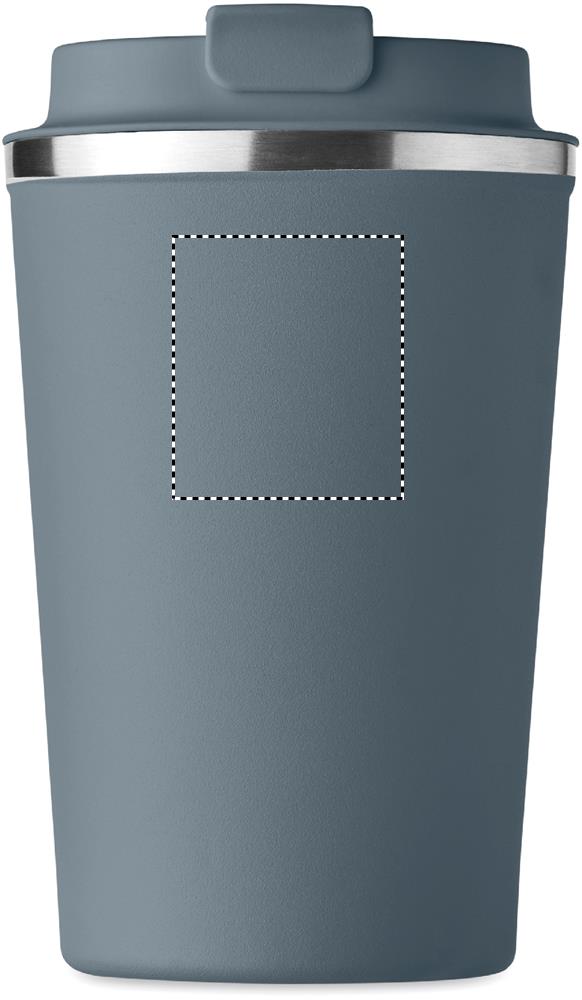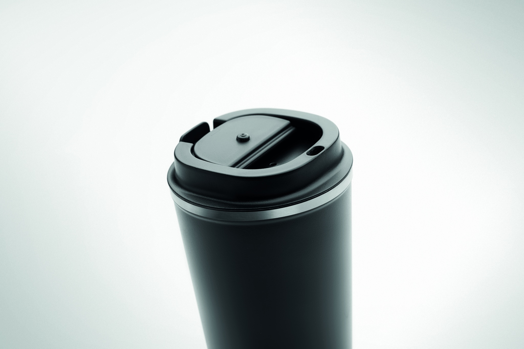 Dvigubos sienelės nerūdijančio plieno stiklinė su PP dangteliu. Talpa: 350 ml. Nesandarus.