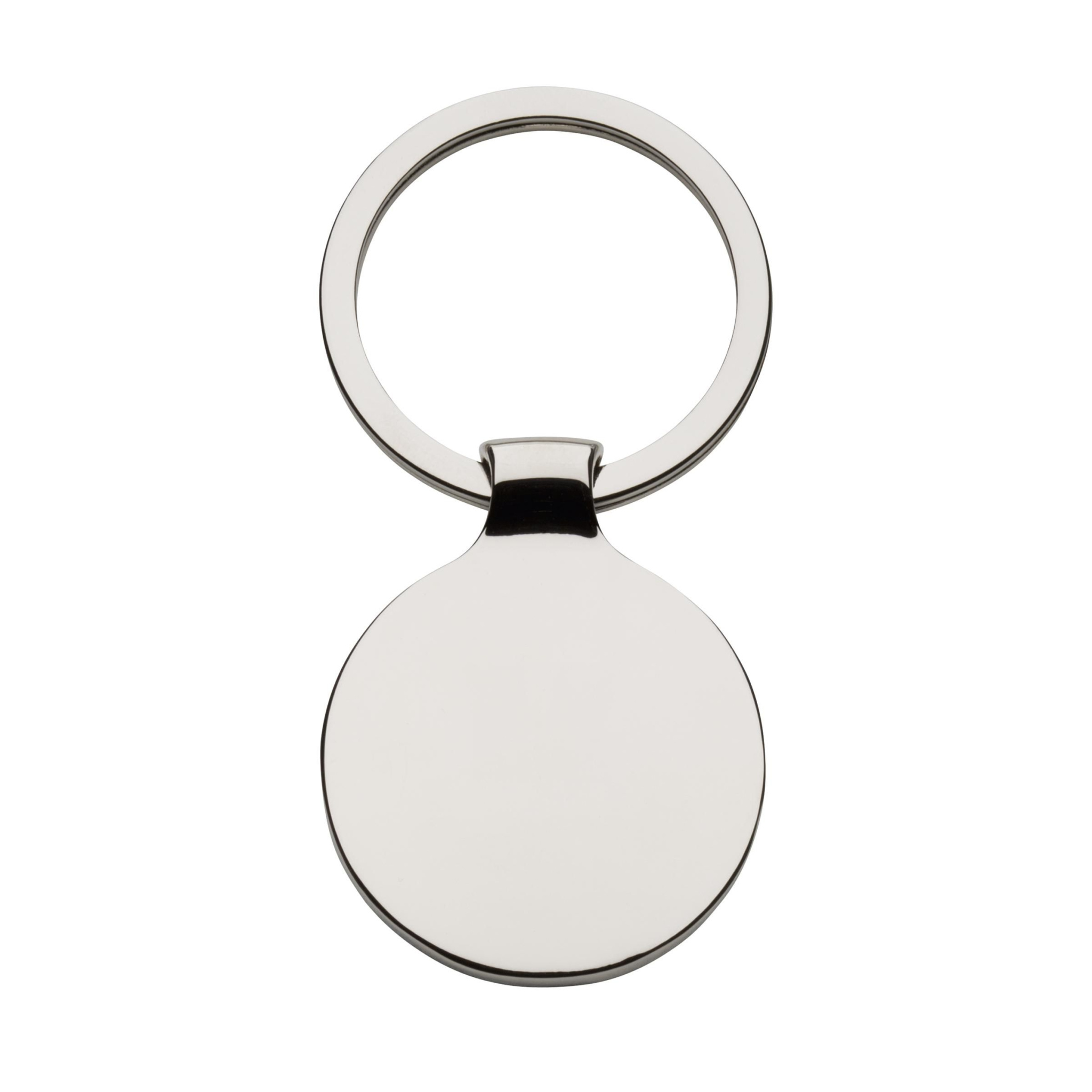Apvalus, poliruotas, nikelio metalo raktų pakabukas su juodu įdėklu ir tvirtu raktų pakabu. Kiekviena prekė tiekiama atskirame rudame kartoniniame voke.
