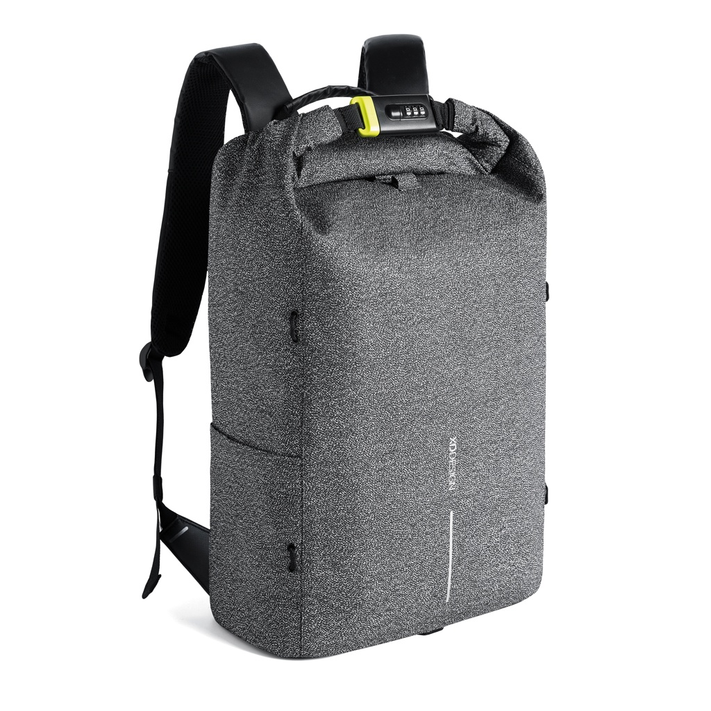 Apsaugota nuo vagystės miesto kuprinė yra puiki jūsų kelionės kompanionė. Pagamintas iš aukštos kokybės, pjovimui atsparaus audinio, pagrindinis skyrius užtikrina visišką saugumą su plienu sustiprintu kombinuotu užraktu, kuris taip pat gali būti naudojamas užrakinti krepšį aplink fiksuotą objektą. Paslėptos kišenės nugaroje ir peties dirželyje suteikia RFID apsaugotą vietą kortelėms. Krepšyje yra šoninė vandens buteliuko kišenė ir nuimamas elastinis tinklelis sportinei įrangai. Viduje paminkštinti skyriai tinka 15,6 colio nešiojamam kompiuteriui, planšetiniam kompiuteriui iki 12,9 colio, o tinklinės kišenės pagerina jūsų būtiniausių daiktų organizavimą. Registruotas dizainas®.