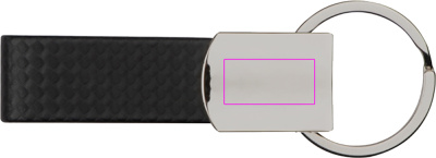 Elegantiškas metalinis raktų pakabukas su anglies išvaizdos dirželiu. Jūsų logotipas bus išgraviruotas ant chromuoto paviršiaus.