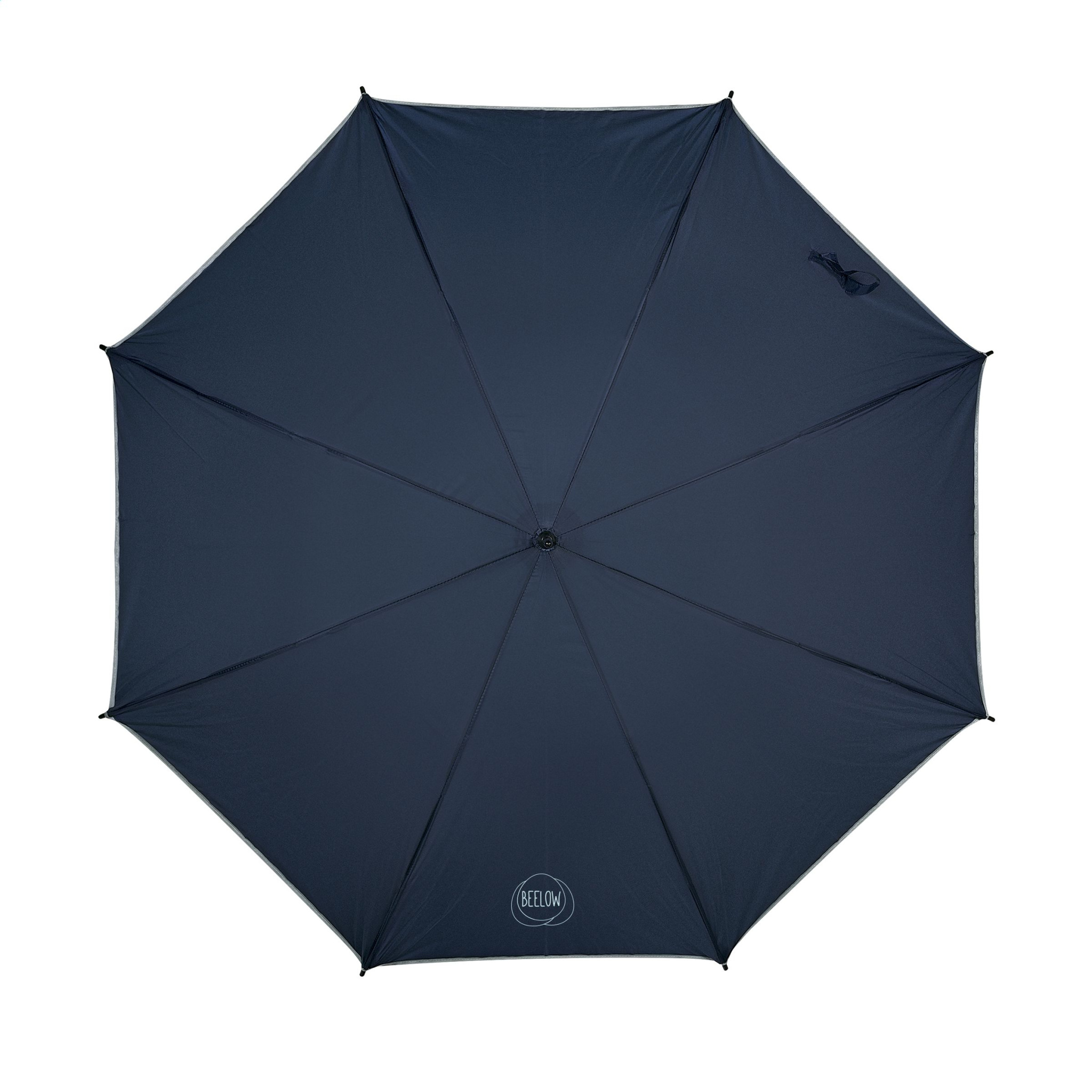 Lengvas audrai atsparus skėtis su atspindinčia apdaila, 190T poliesterio stogeliu, stiklo pluošto rėmu, metaliniu kotu, minkšta rankena ir velcro užsegimu.