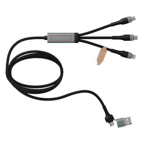 5 viename itin greitas rPET 100 W itin greito įkrovimo laidas, kuriuo galima įkrauti išmaniuosius telefonus, planšetinius kompiuterius ir nešiojamuosius kompiuterius. Dvigubas USB-A + USB-C įvestis užtikrina, kad laidas 100% suderinamas su naujausiais kompiuterių modeliais. Išvestis: Type-C, Micro USB ir Lightning. Pristatomas su perdirbamu TPU maišeliu ir perdirbto popieriaus įdėklu. Kabelio ilgis: 1 metras.