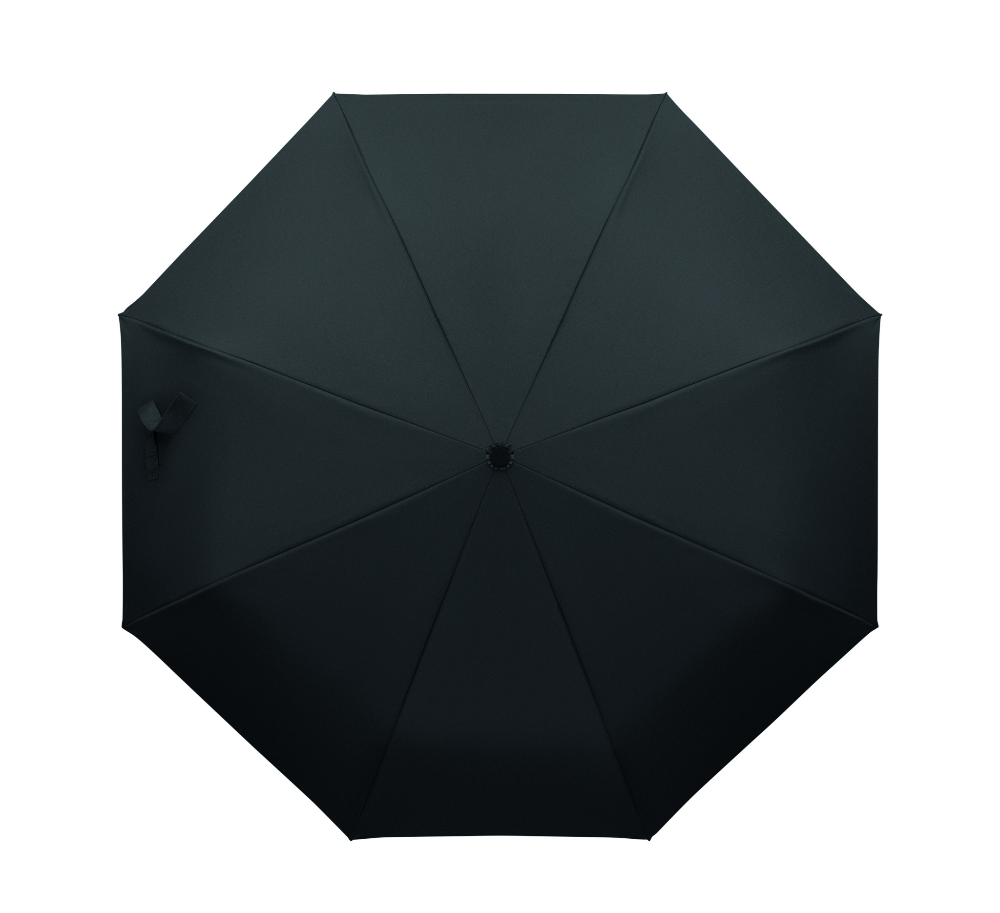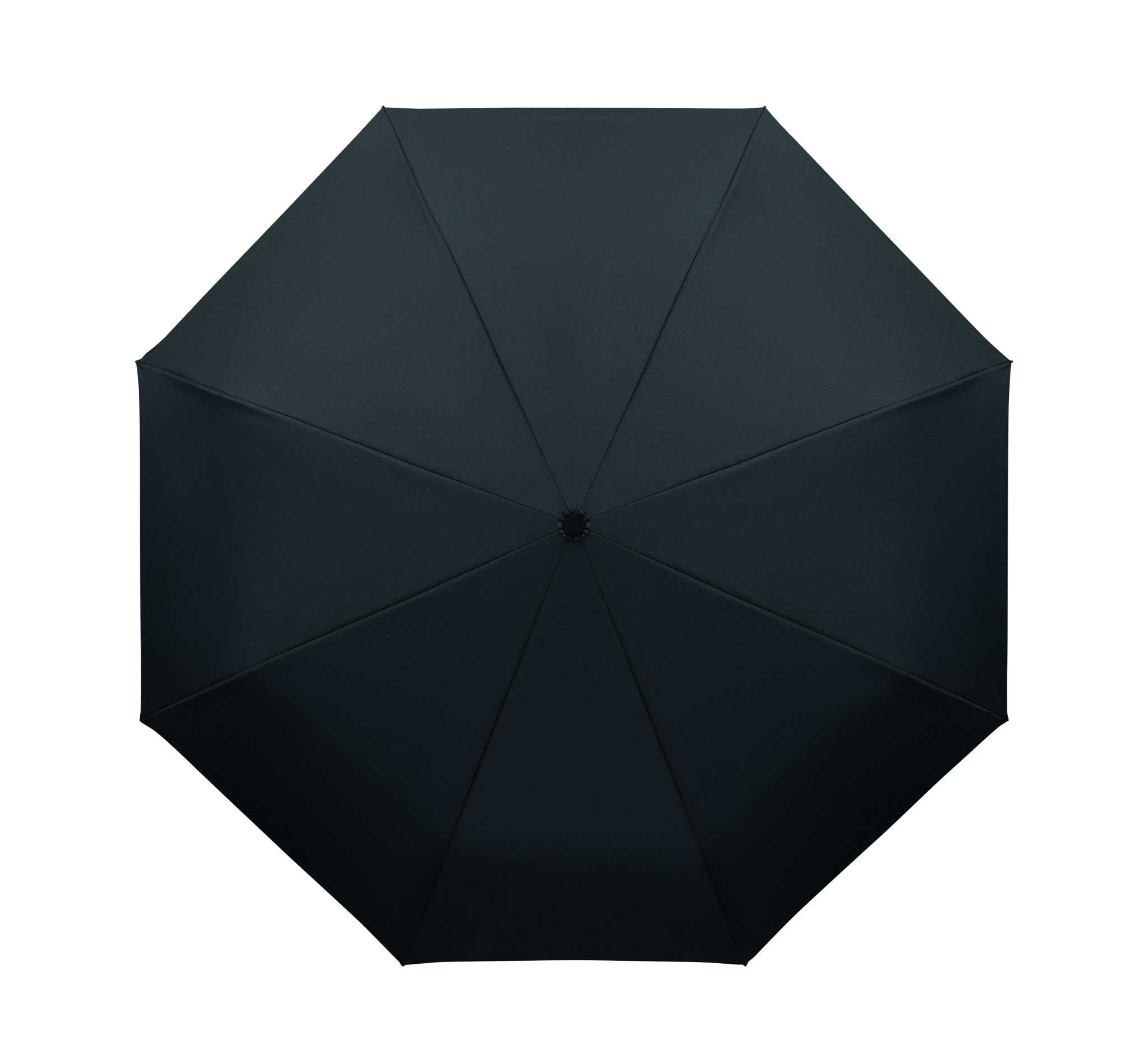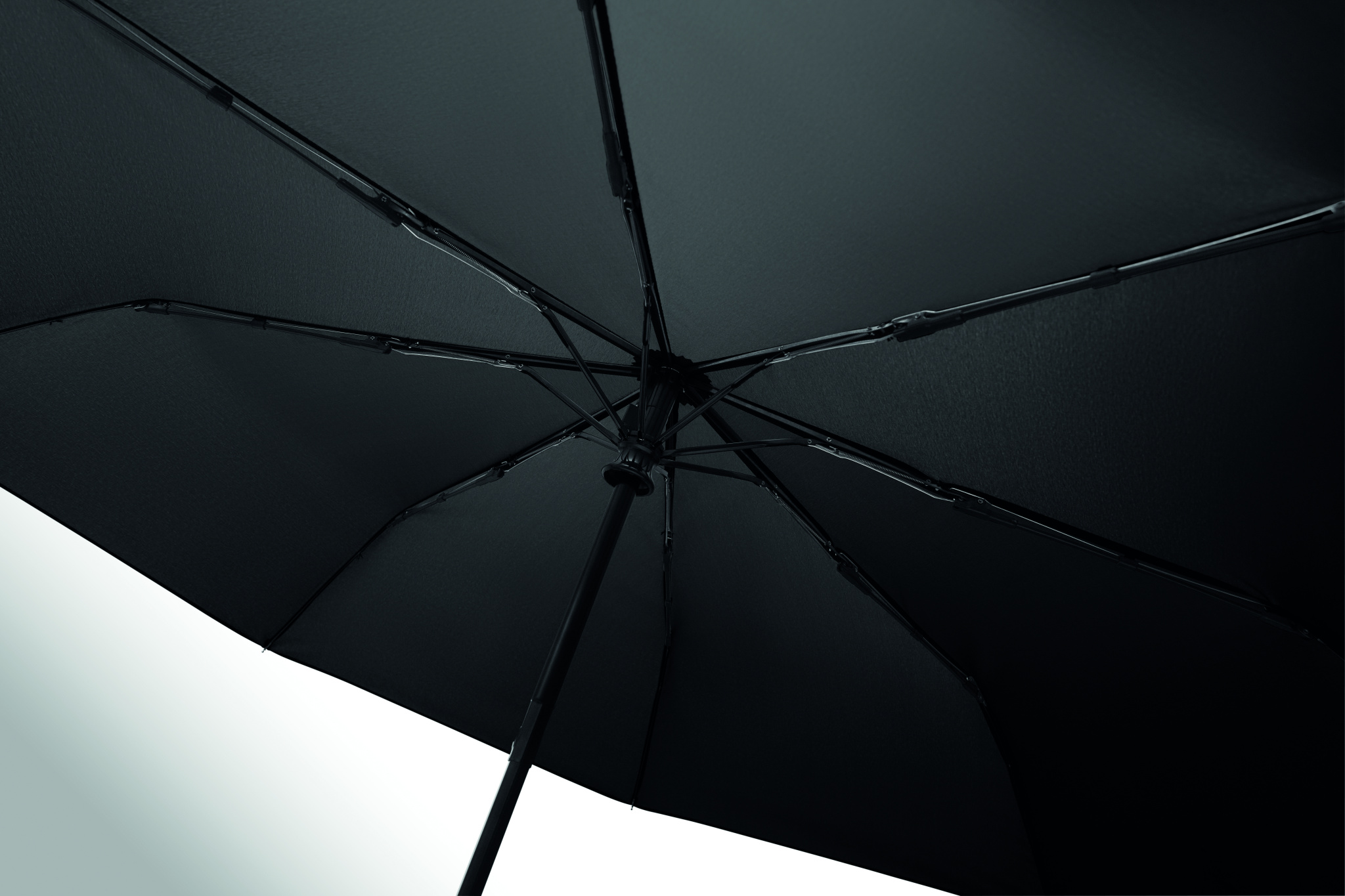 Salokāms 21 collu vēja necaurlaidīgs lietussargs ar pilnībā melnu stiklšķiedras rāmi ar 2 sekcijām. Stiklšķiedras ribas. 190T RPET pongee paneļi. D formas karabīnes rokturis ar gumijas apdari. Automātiska atvēršana un aizvēršana. Komplektā iekļauta kabata.