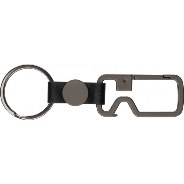 Grafīta krāsas atslēgu piekariņš ar karabīni, atslēgu piekariņu un pudeļu attaisāmo. Jūsu logotips tiks iegravēts uz apaļā gabala.