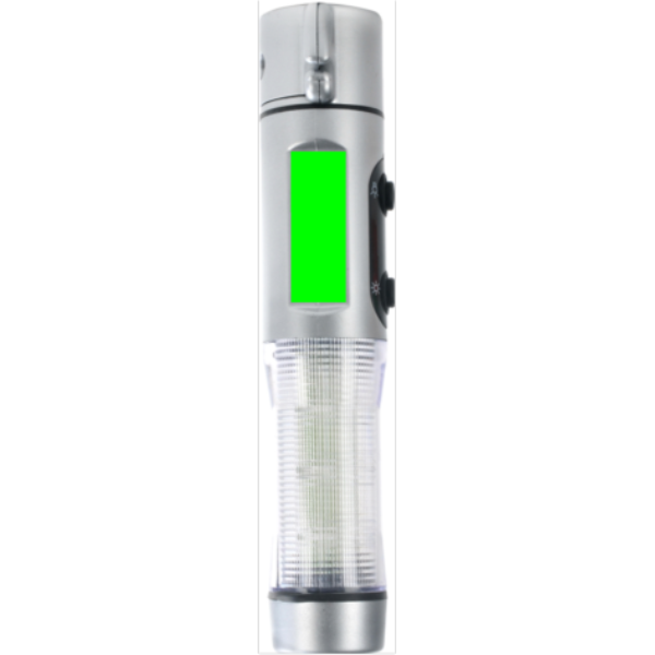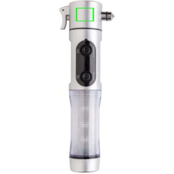 Avārijas gaisma, sudraba ABS korpuss, 1 balts LED un 9 sarkani zibspuldzes sānos, griezējs, logu lauzējs un magnētiska pamatne novietošanai uz automašīnas jumta.