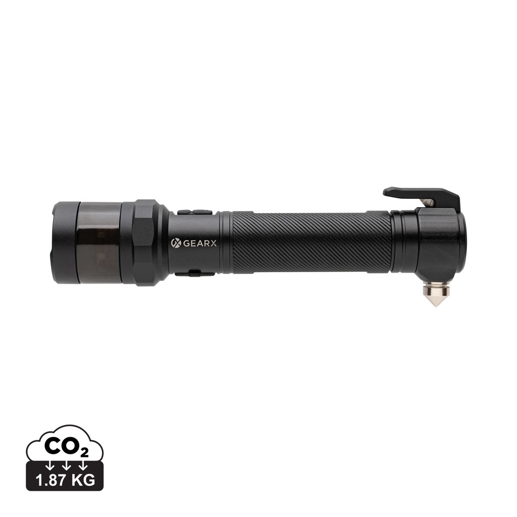 Lieljaudas automašīnas drošības instruments, kas izgatavots no RCS sertificēta pārstrādāta alumīnija un ABS. Kopējais pārstrādātais saturs: 59%, pamatojoties uz kopējo preces svaru. RCS sertifikācija nodrošina pilnībā sertificētu pārstrādāto materiālu piegādes ķēdi. Deglis izmanto atkārtoti uzlādējamu A klases 2000 mah litija akumulatoru, tāpēc baterijas nav jāmaina. Vienkārši atkārtoti uzlādējiet, izmantojot USB ligzdu. Ar jaudīgu 500 lūmenu lāpu ar staru kūli līdz 100 metriem. Gaismas diodei ir 4 režīmi (100%, 50%, 30% un mirgojošs) Ar sarkanu avārijas LED, kas var darboties 3 režīmos (ātrā zibspuldze, lēna zibspuldze un SOS). Ar integrētu lentes griezēju un logu āmuru. Ar magnētu, lai to piestiprinātu pie magnētiskas virsmas. Darbības laiks ar vienu uzlādi: 2 stundas. IPX 4 ūdensizturīgs.