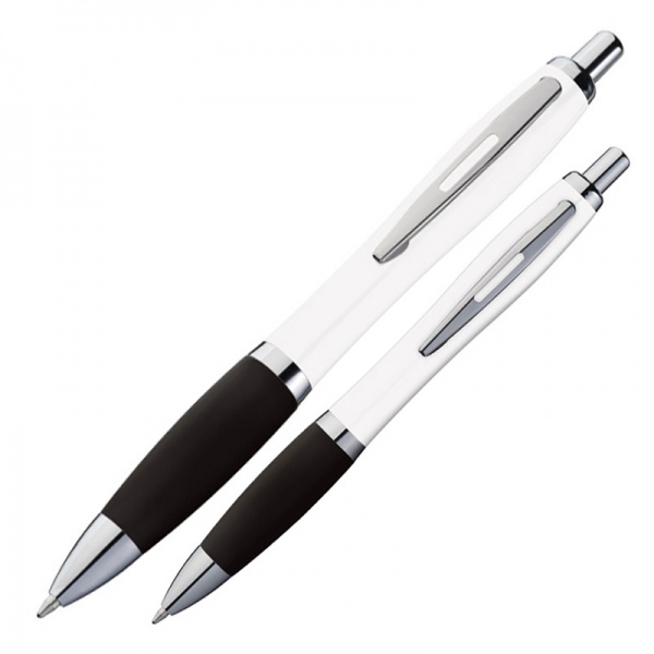 Lodīšu pildspalva ar baltu stobru, metāla klipsi, zilas rakstīšanas lielas ietilpības uzpilde un krāsainu mīksta pieskāriena satvēriena zonu. Mēs drukājam jūsu logotipu klipa labajā pusē.