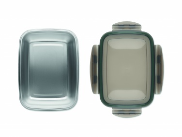 Pārstrādāta nerūsējošā tērauda pusdienu kastīte ar pārstrādāta PP vāku un 4 sānu aizdari. Tilpums: 850 ml.
