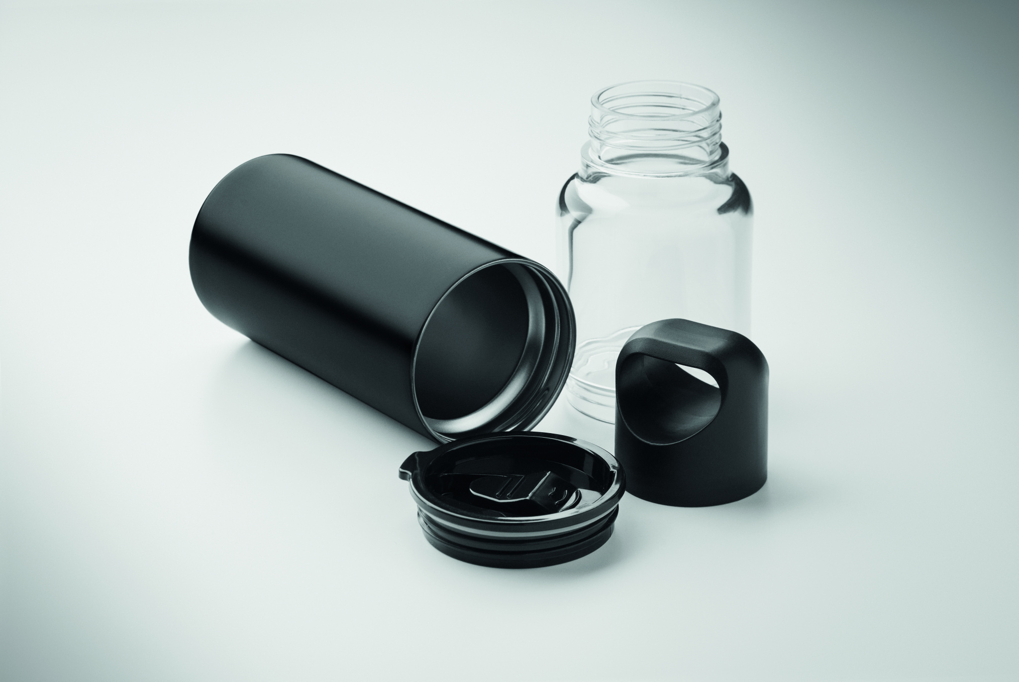 Refillable 2 in 1 bottle in Tritan and double wall tumbler part in recycled stainless steel (90 % recycled and 10% stainless steel). 2 lids in PP material. Capacity total 610 ml, tumbler 350 ml.