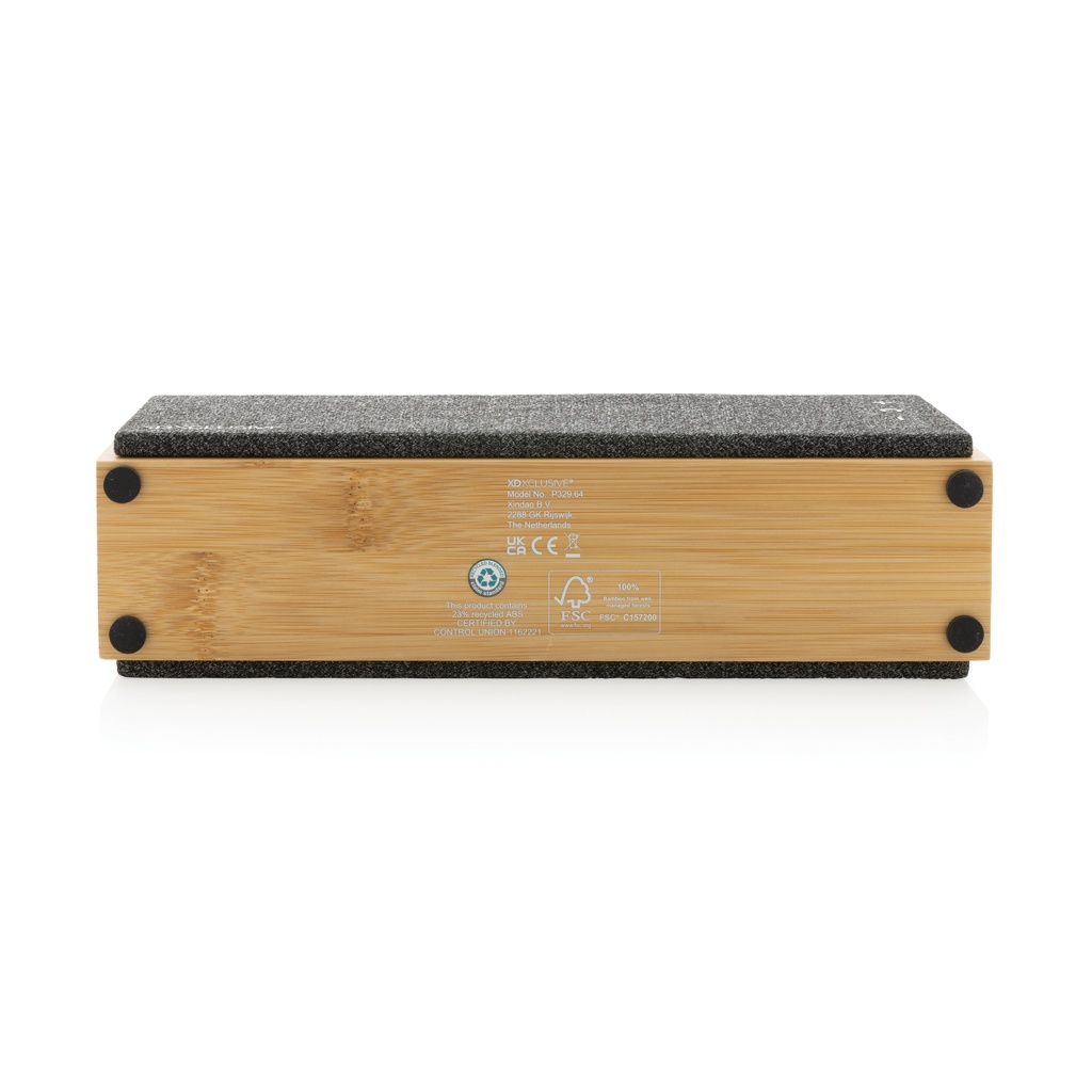 Роскошный динамик мощностью 10 Вт с чистым звуком и мощными басами. Внешний корпус изготовлен из бамбука, сертифицированного FSC на 100%. Пластиковые компоненты изготовлены из переработанного АБС-пластика, сертифицированного по стандарту RCS (Recycled Claim Standard). Общее содержание переработанных материалов: 23 % от общего веса изделия. Сертификация RCS гарантирует полностью сертифицированную цепочку поставок переработанных материалов. Динамик оснащен Bluetooth 5.1 для легкой и плавной работы на расстоянии до 10 метров и низкого энергопотребления. Аккумулятор емкостью 1200 мАч обеспечивает до 6 часов воспроизведения и может быть полностью перезаряжен за 2 часа. С функцией подхвата и микрофоном для ответа на (видео) звонки. Упакован в крафт-бокс FSC mix. Включает сертифицированный RCS переработанный кабель для зарядки TPE.