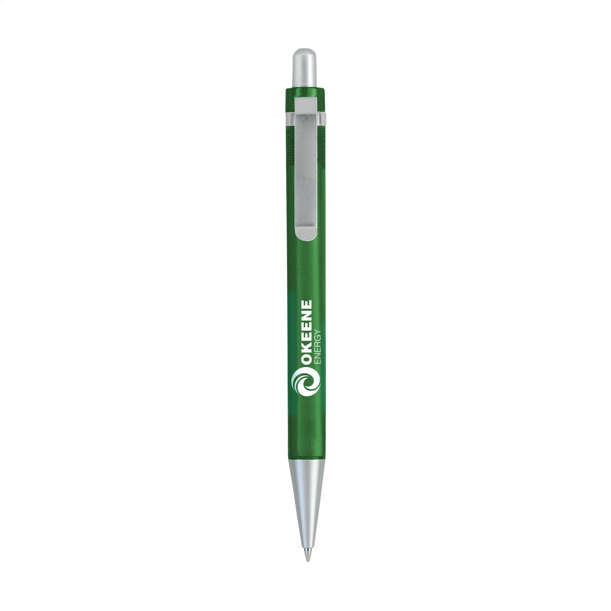 Шариковая ручка с синими чернилами, полупрозрачным цветным корпусом и матовым металлическим клипом.