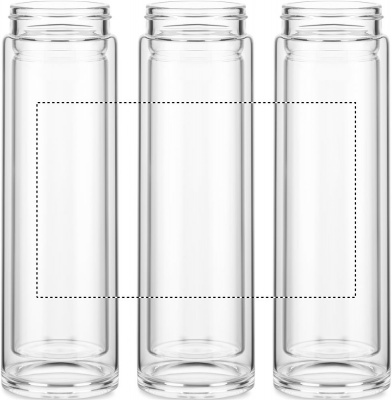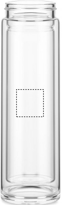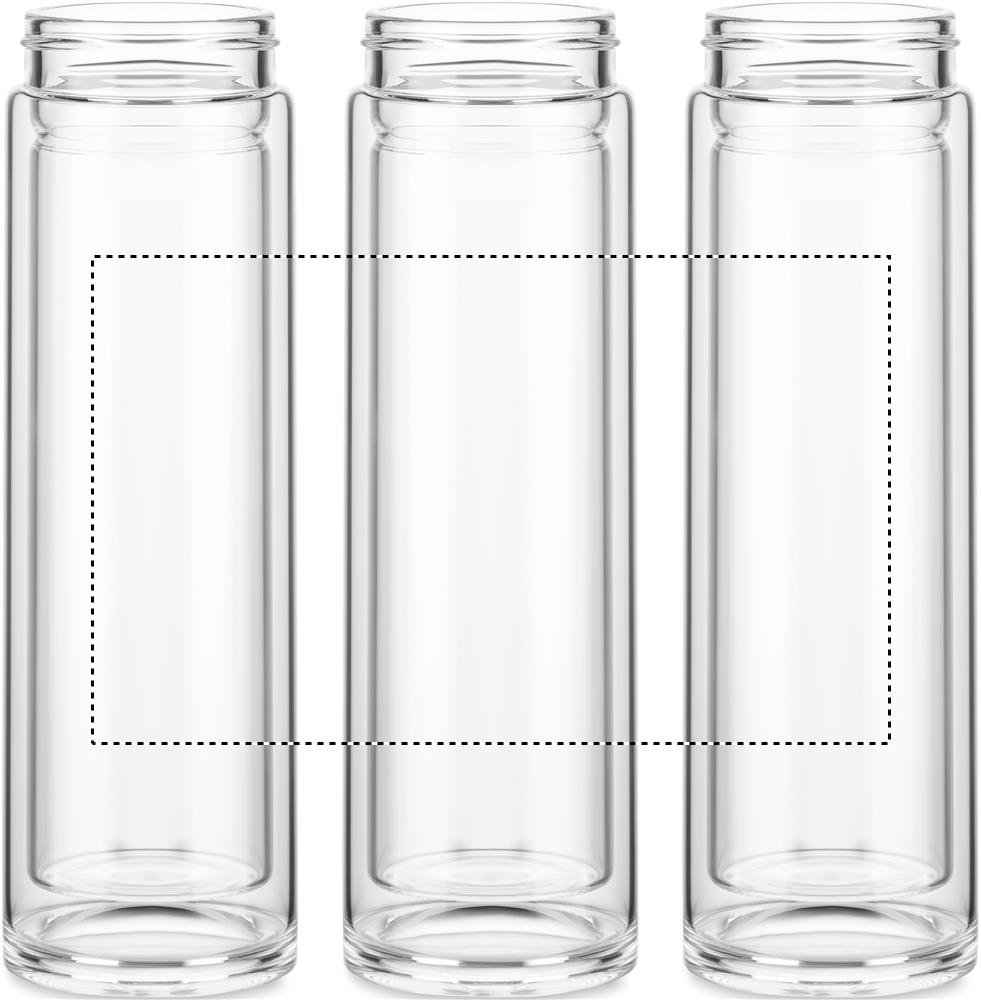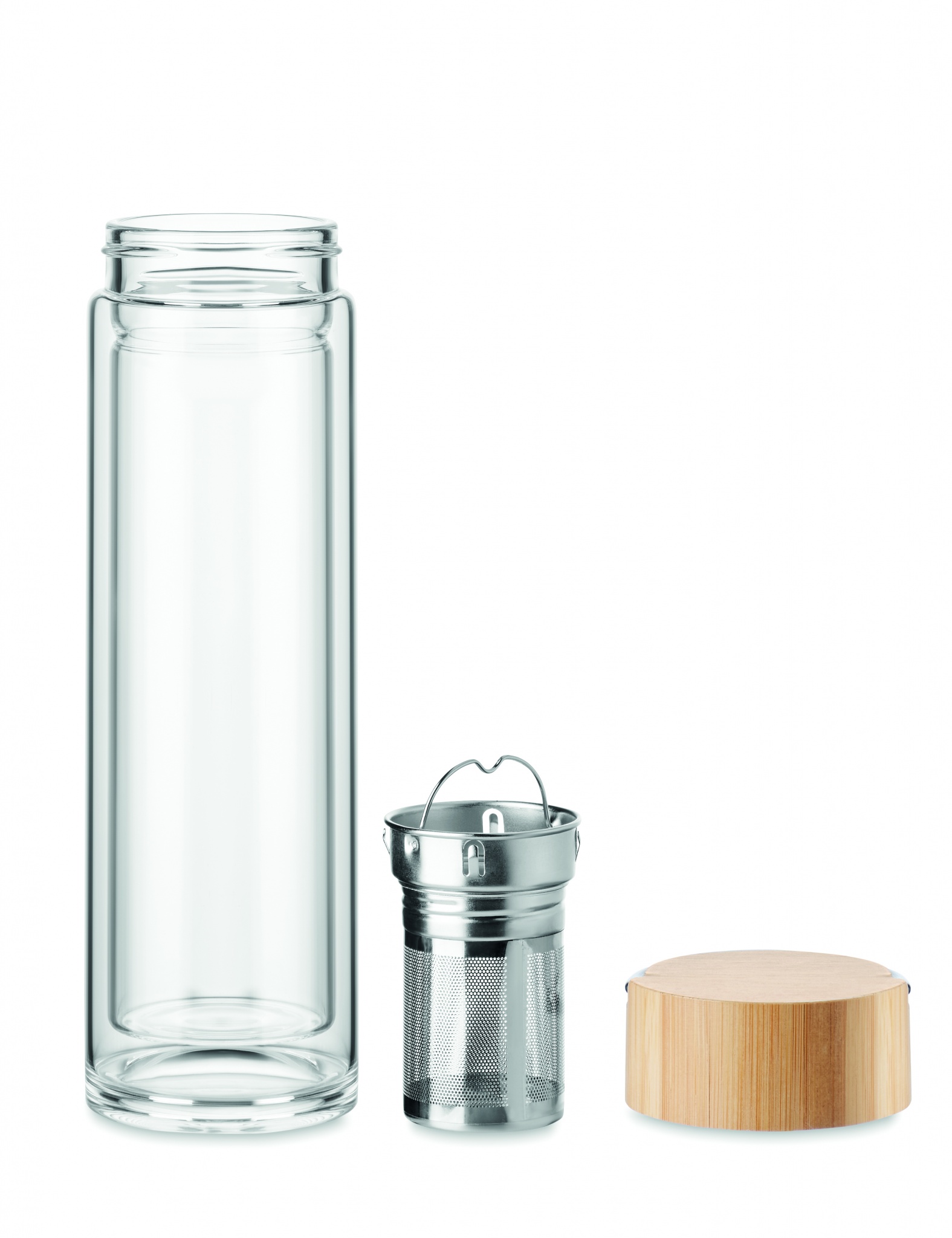 Бутылка с двойными стенками из высокопрочного боросиликатного стекла и насадкой для чая. Бамбуковая крышка имеет металлическую ручку для переноски. Объем: 400 мл.