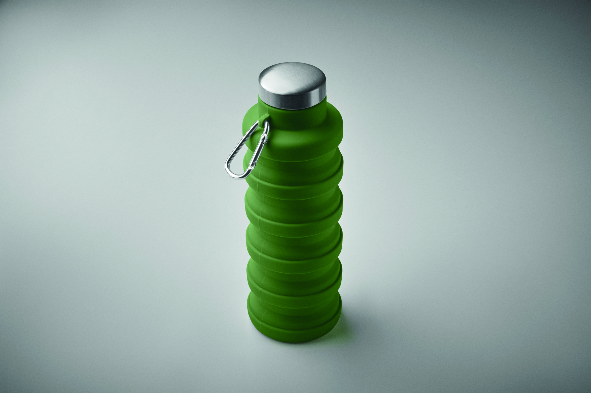 Collapsible silicone bottle with stainless steel lid and aluminium carabiner. The carabiner is not for climbing (non-professional use). Capacity: 500 ml.