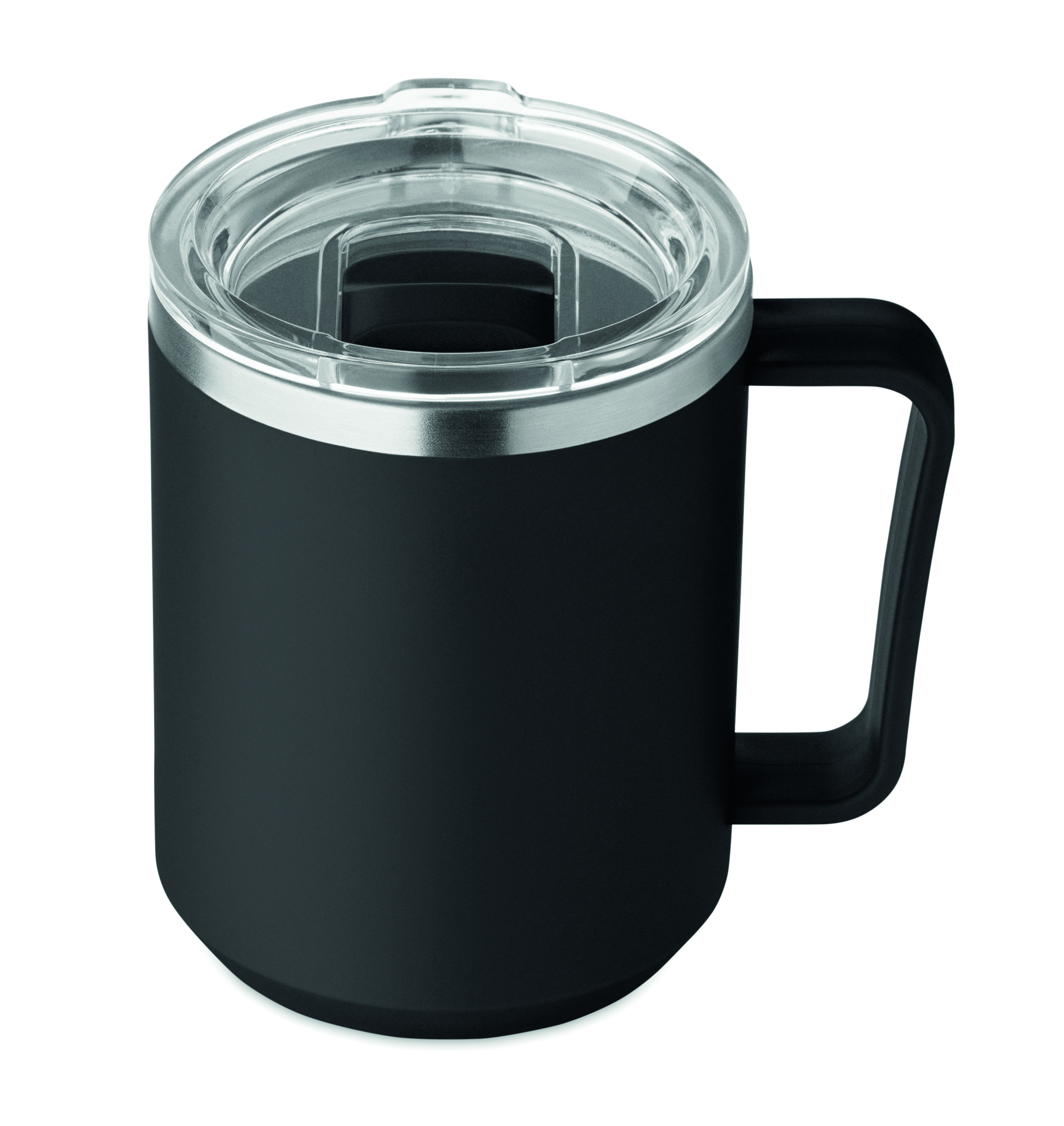 Double wall mug with 90 % recycled stainless steel and 10% stainless steel interior and recycled PP exterior. Includes transparent AS sliding lid. Capacity 400ml.