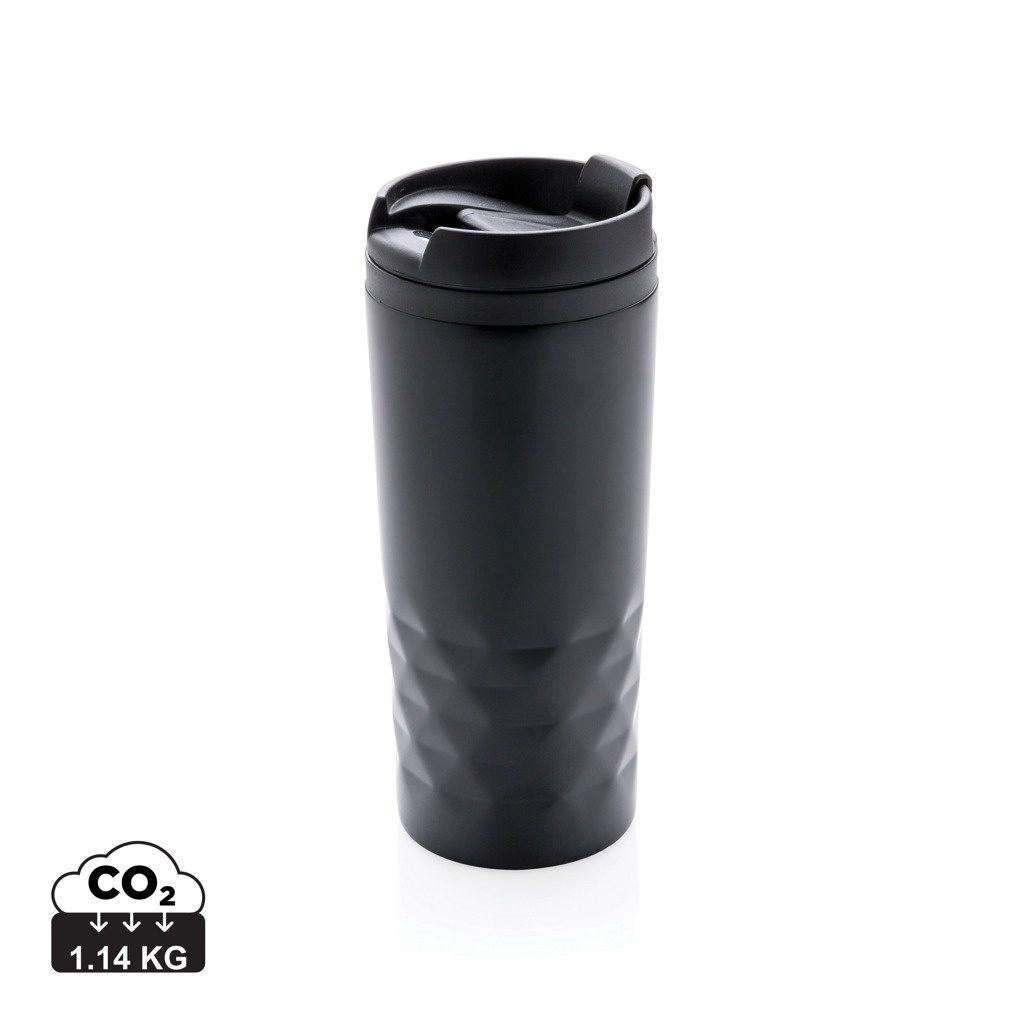 Модный стакан из нержавеющей стали с геометрическими деталями. Внутренний корпус изготовлен из пластика. Мыть только вручную. Объем 300 мл.