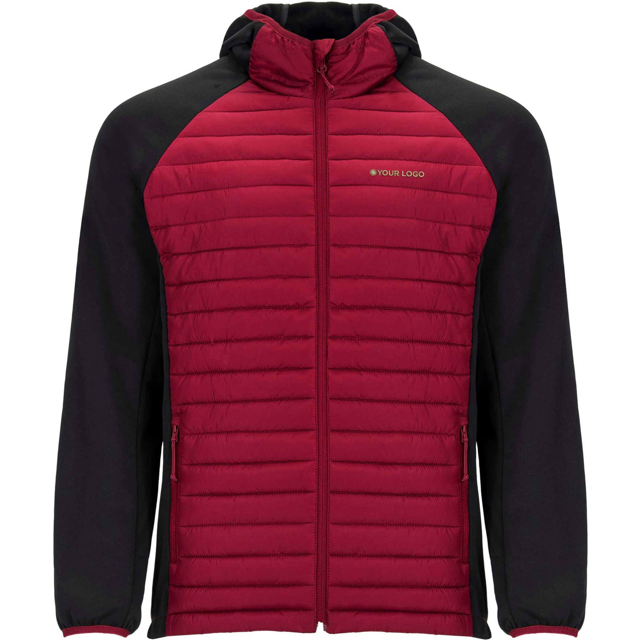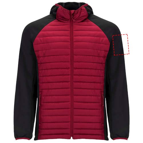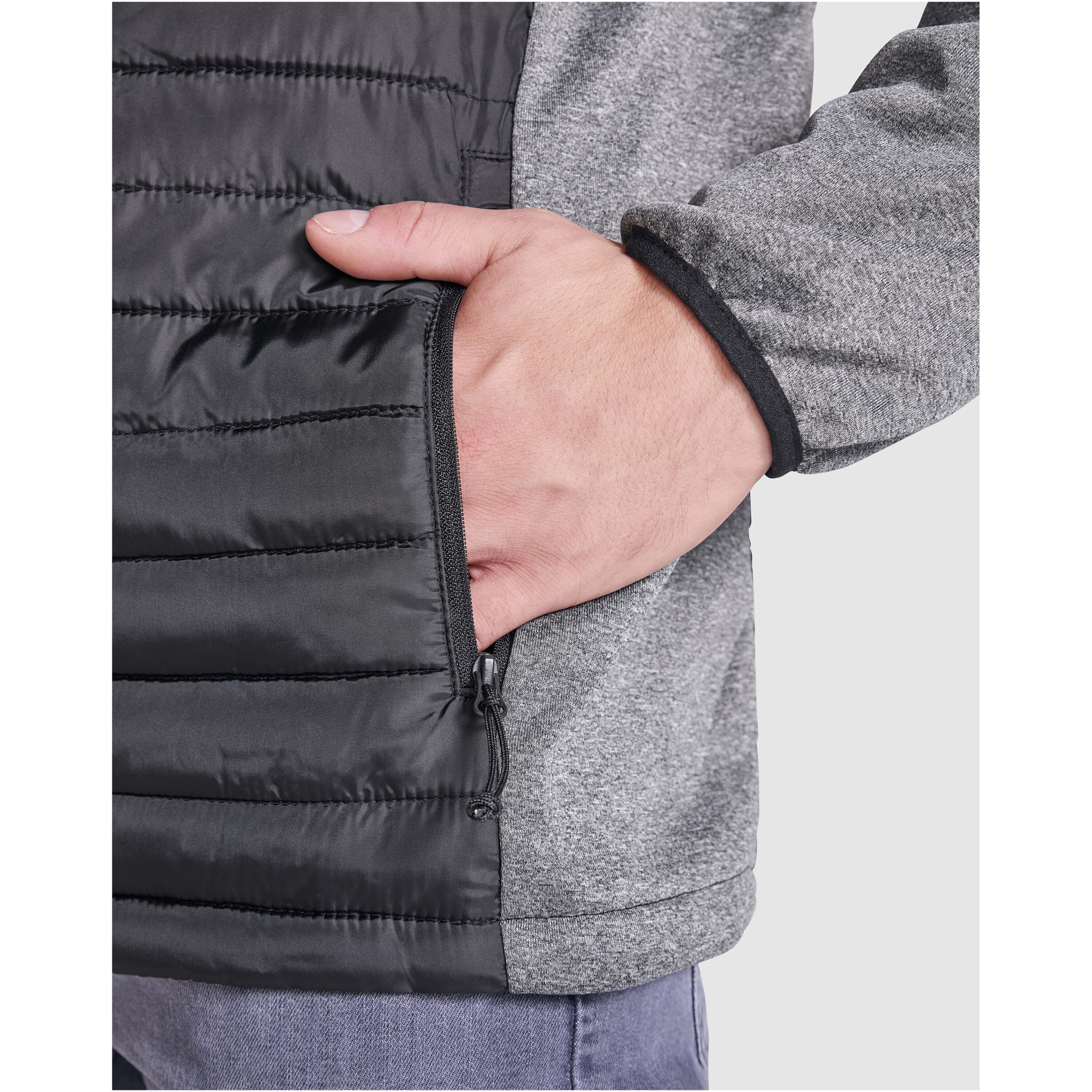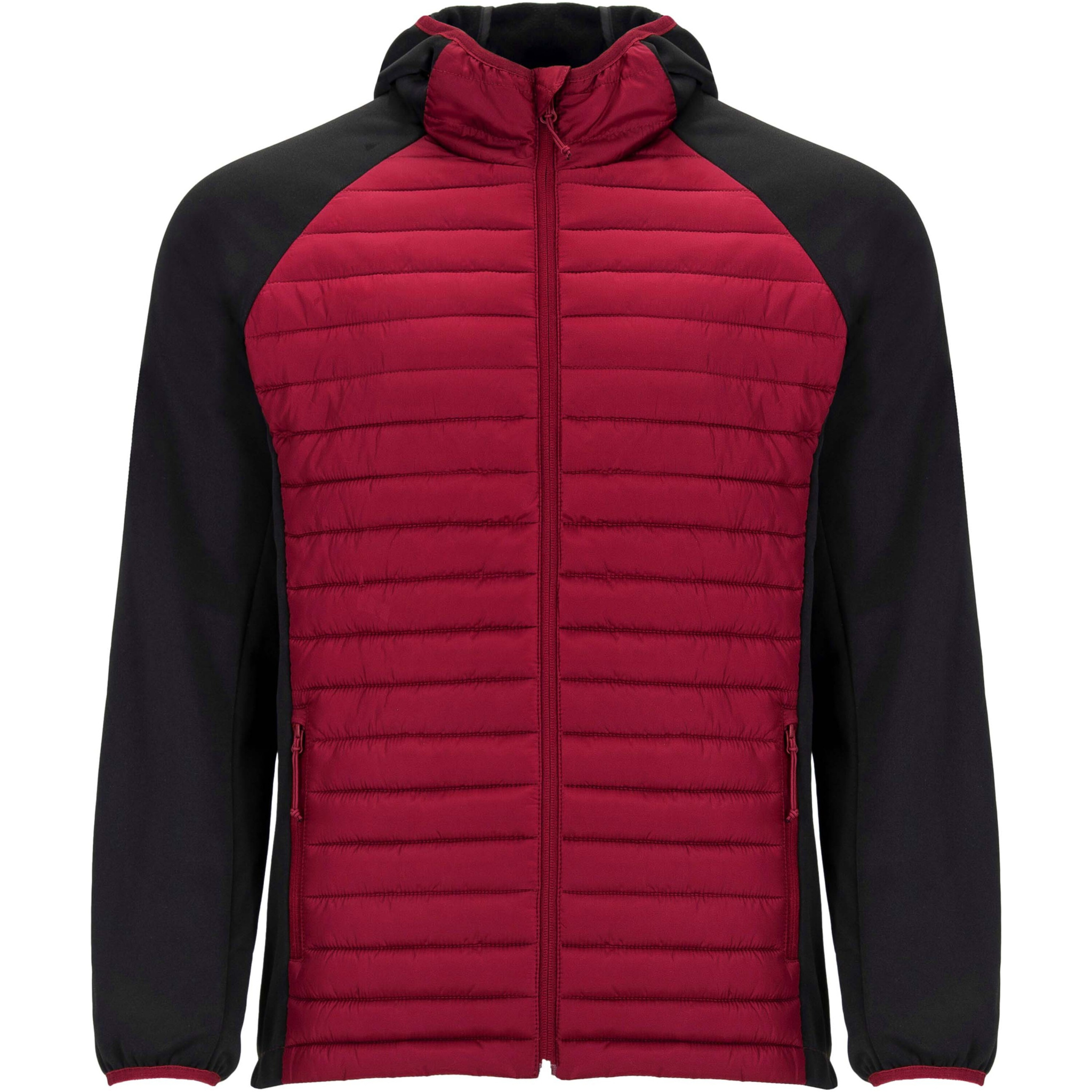 Мужская куртка из двух комбинированных тканей. Несъемный регулируемый капюшон. Рукава реглан. Рукава, боковые вставки и капюшон из ткани софтшелл. Стеганая ткань с наполнителем с эффектом пера спереди и сзади. Обратная молния в тон с бегунком и защитой для подбородка. Два кармана спереди с молнией. Воротник, манжеты и низ с эластичной окантовкой в тон. Съемная этикетка. Ветрозащитная модель.