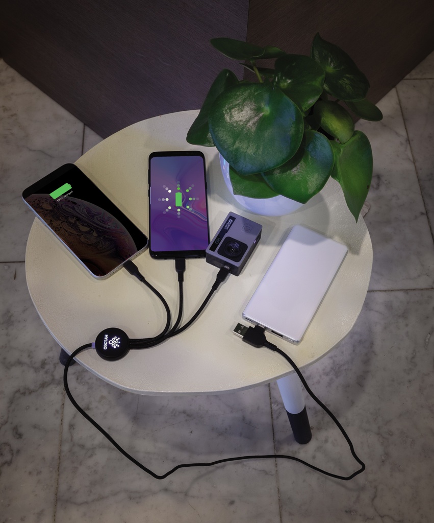 Многожильный кабель из плетеного нейлона с 5 различными разъемами: вход USB C, вход USB A, выход Type C, выход IOS и выход micro USB. Это позволяет использовать кабель также с выходными устройствами Type C, которые включены в новое поколение телефонов и компьютеров MacBook. Кабель также имеет опцию входа USB A, поэтому он может заряжать любое устройство от любого источника выходного сигнала. Корпус из ABS с возможностью гравировки вашего логотипа, который будет светиться при использовании кабеля. Не содержит ПВХ. Длина 120 см.