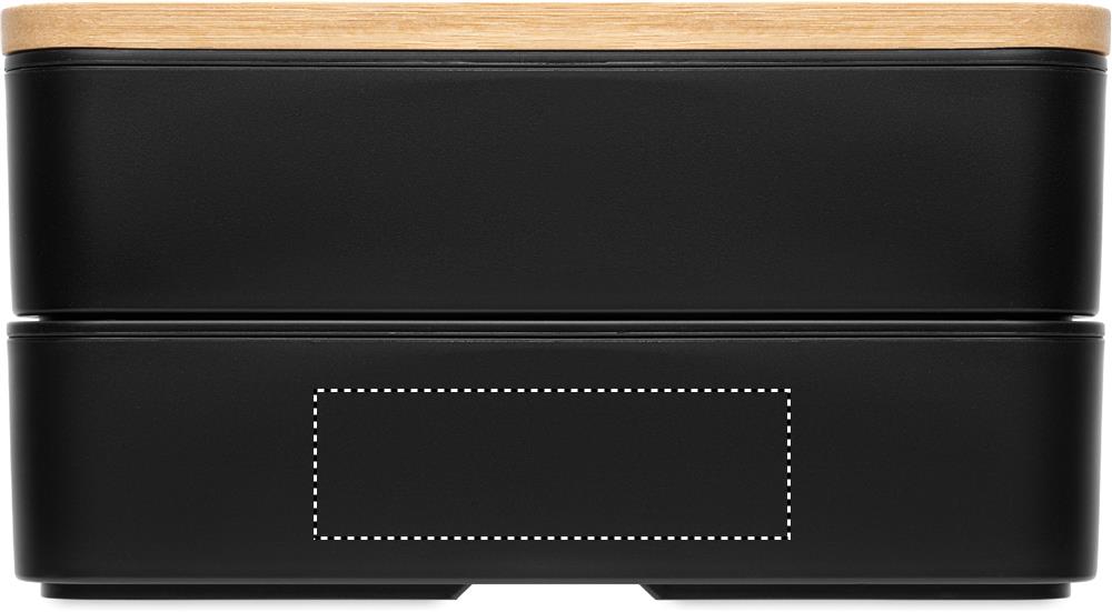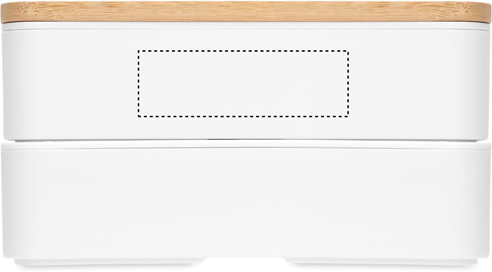 Двухуровневый пластиковый ланчбокс на ленте из полиэстера с бамбуковой крышкой, съемным разделителем и столовыми приборами. Вместимость 400 мл (1 отсек).