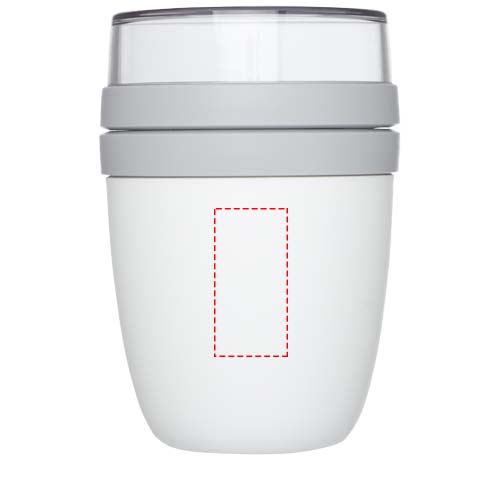 Ланч-бокс с двумя раздельными отделениями, позволяющими хранить различные продукты отдельно друг от друга. Каждое отделение закрывается отдельной крышкой, поэтому они остаются чистыми. Объем верхнего прозрачного контейнера составляет 200 мл, что соответствует примерно 75 граммами твердой пищи. Емкость нижнего контейнера составляет 500 мл. Ланч-бокс изготовлен из прочного материала, поэтому продукты в нем можно хранить в холодильнике, разогревать в микроволновой печи (сняв крышку), а сам ланч-бокс можно мыть в посудомоечной машине. Верхний прозрачный контейнер нельзя использовать в микроволновой печи. Герметичный. Без содержания БФА.