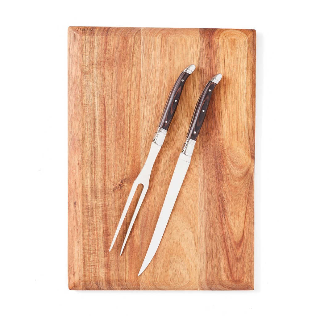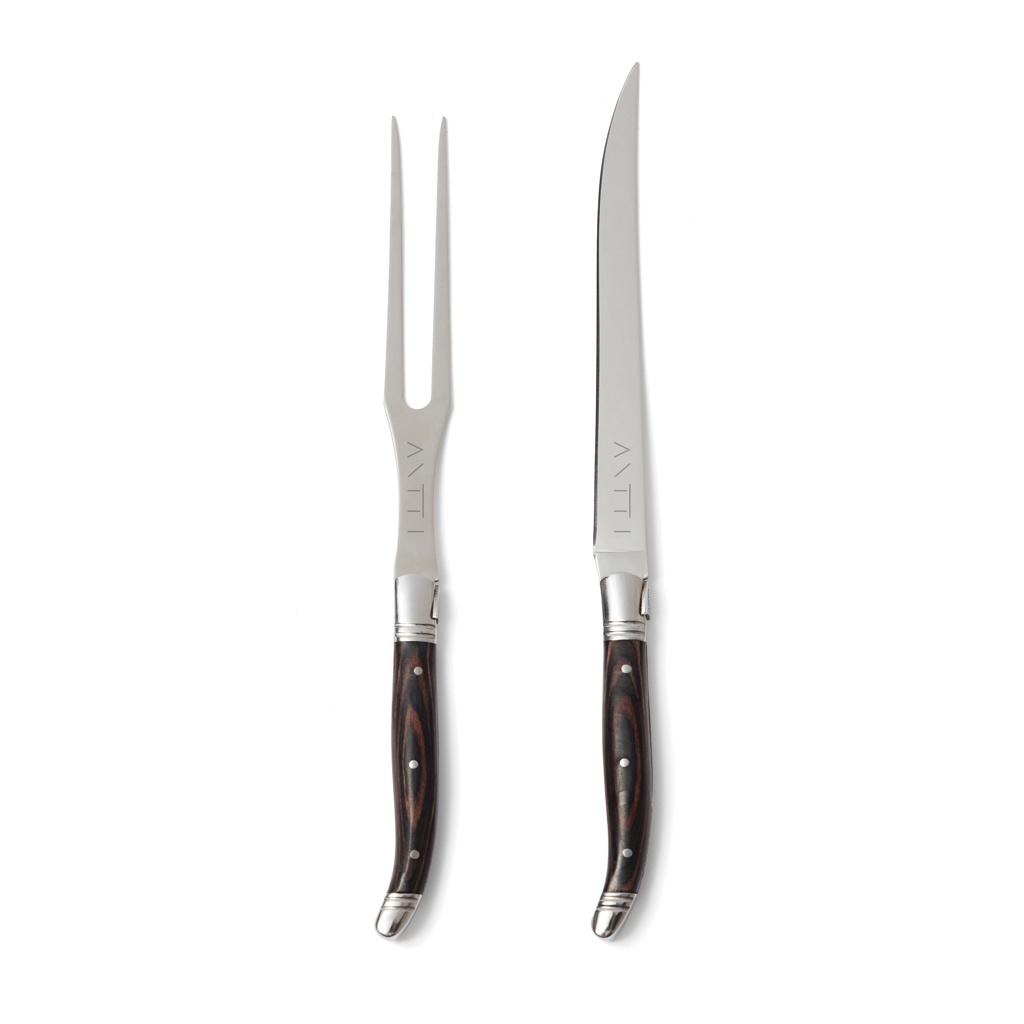 Набор для траншера с ножом и вилкой в типичном стиле французского бистро. Черная ручка из пакка и высококачественные лезвия из нержавеющей стали. Упакован в эксклюзивную подарочную коробку.