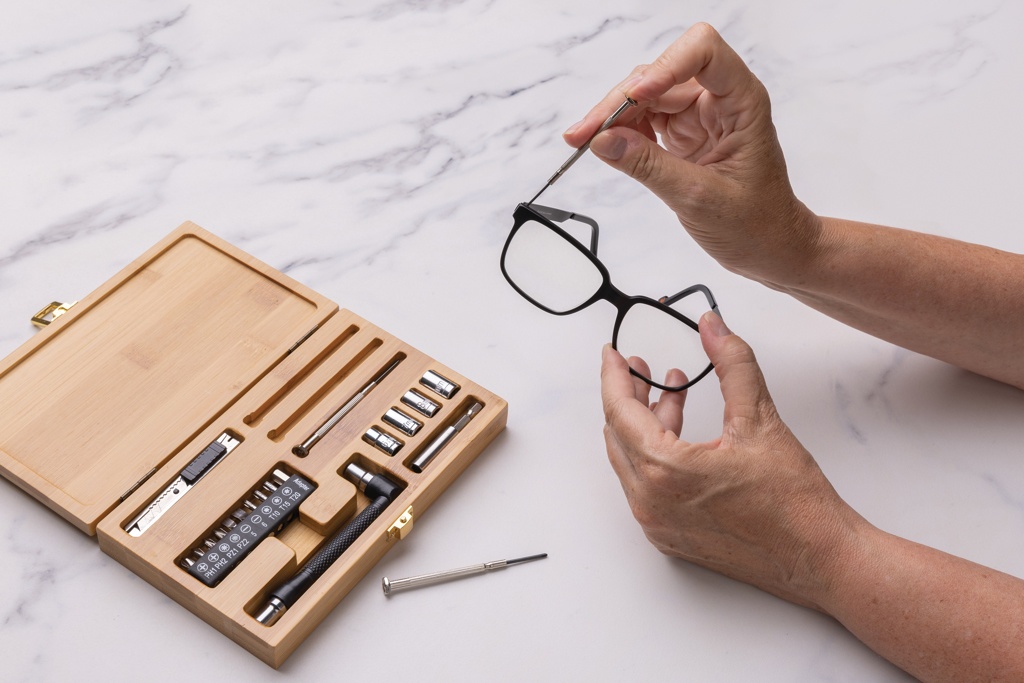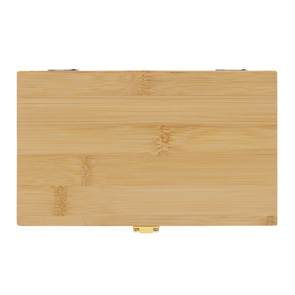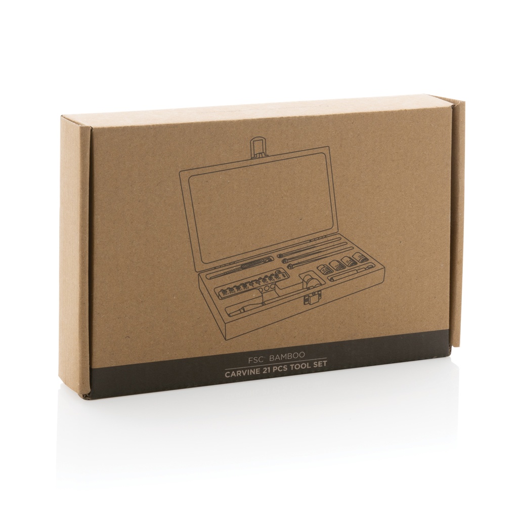 Набор инструментов из 21 предмета в роскошном футляре из 100% бамбука FSC®. В набор входят 3 отвертки, 10 бит в держателе, 4 гнезда, 1 ручка, 1 соединитель, 1 маленький резак. Упаковано в упаковку FSC® mix kraft