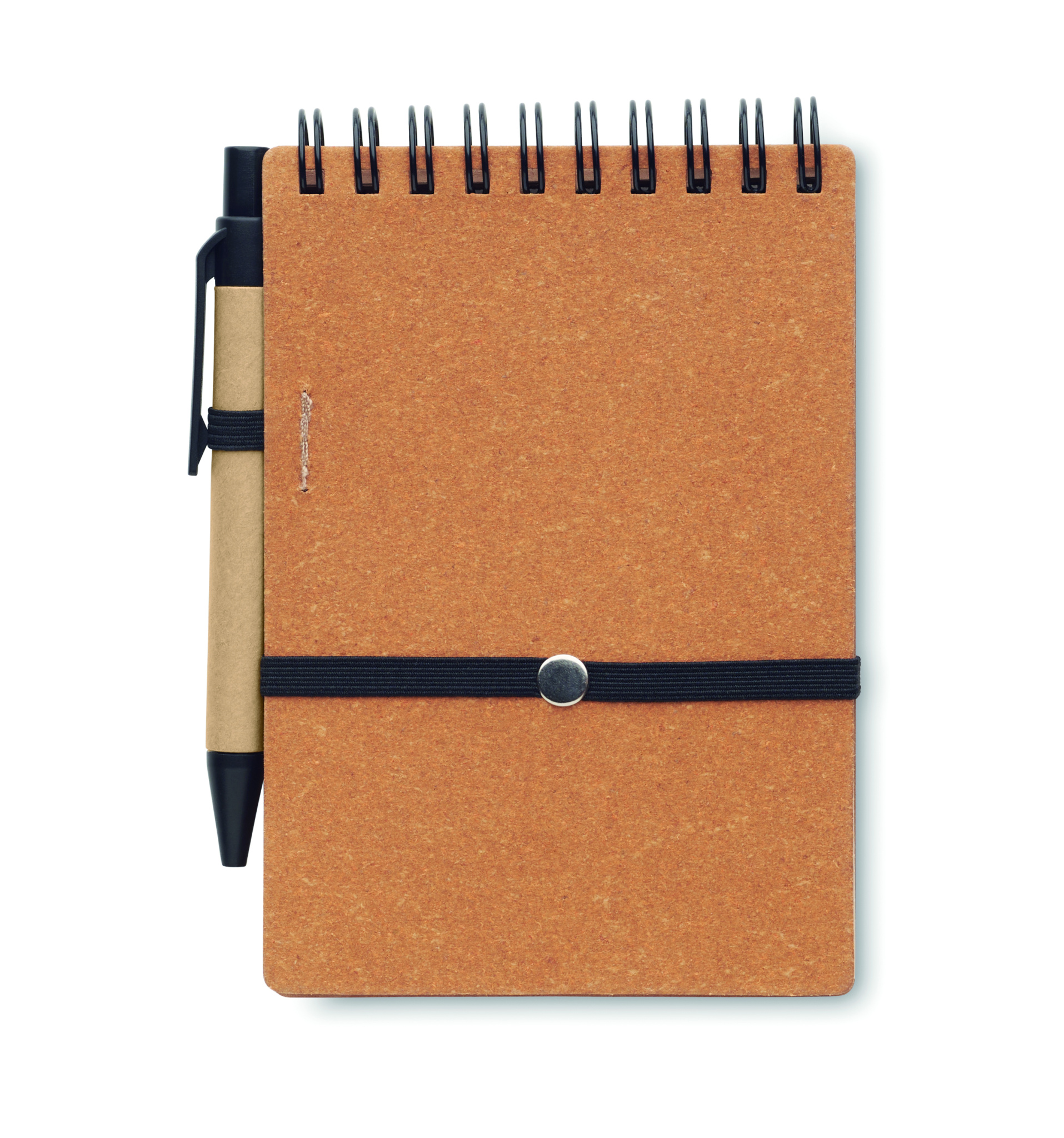 Recycled paper and PU cover (70% recycled paper and 30% PU) notebook. Twin-wire. 140 lined recycled paper pages (70 sheets). Matching push button ball pen in recycled carton and ABS parts. Blue ink. Elastic closure strap and pen holder.