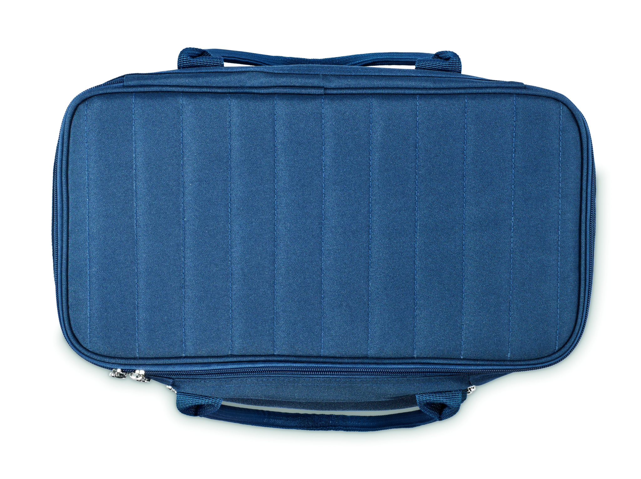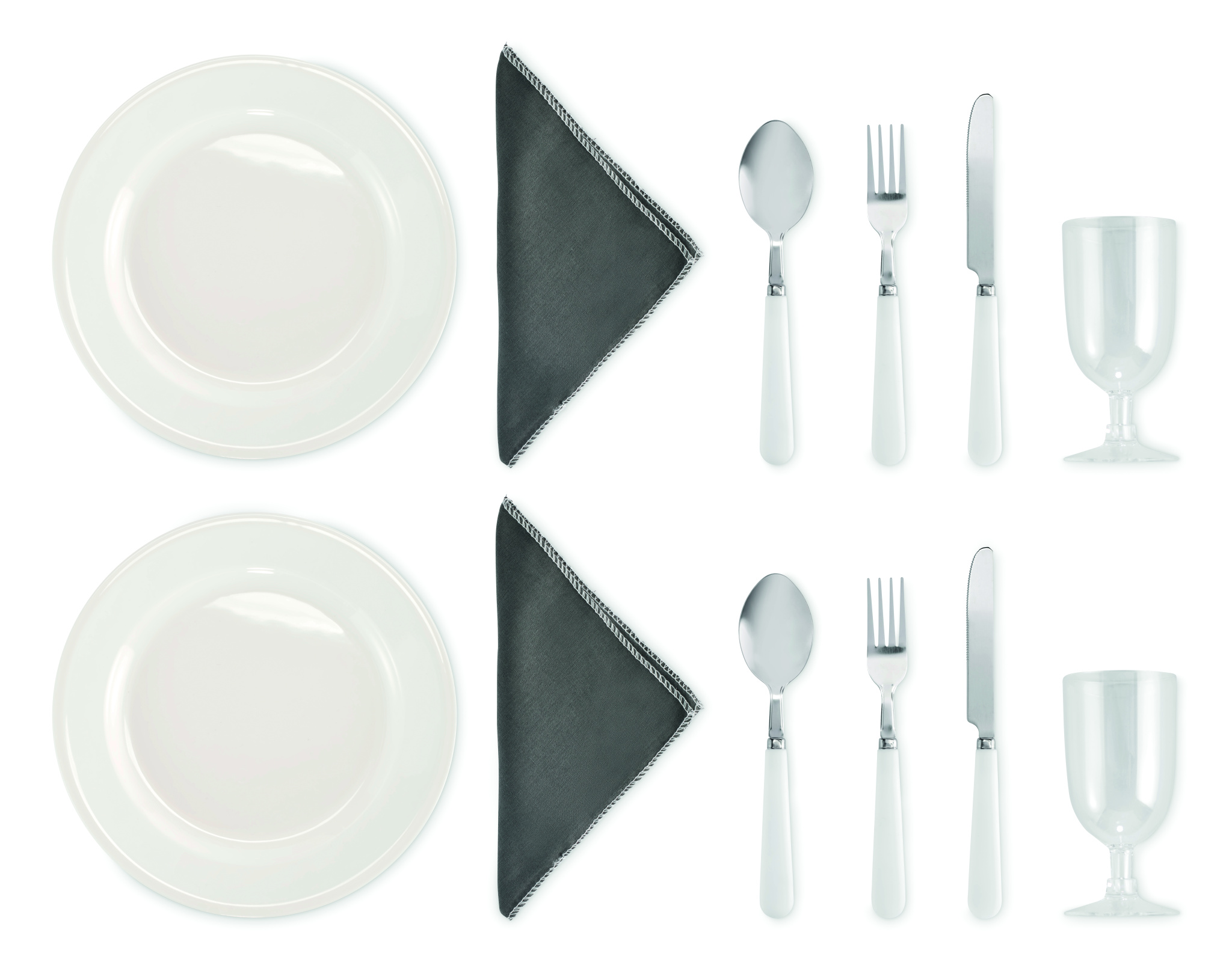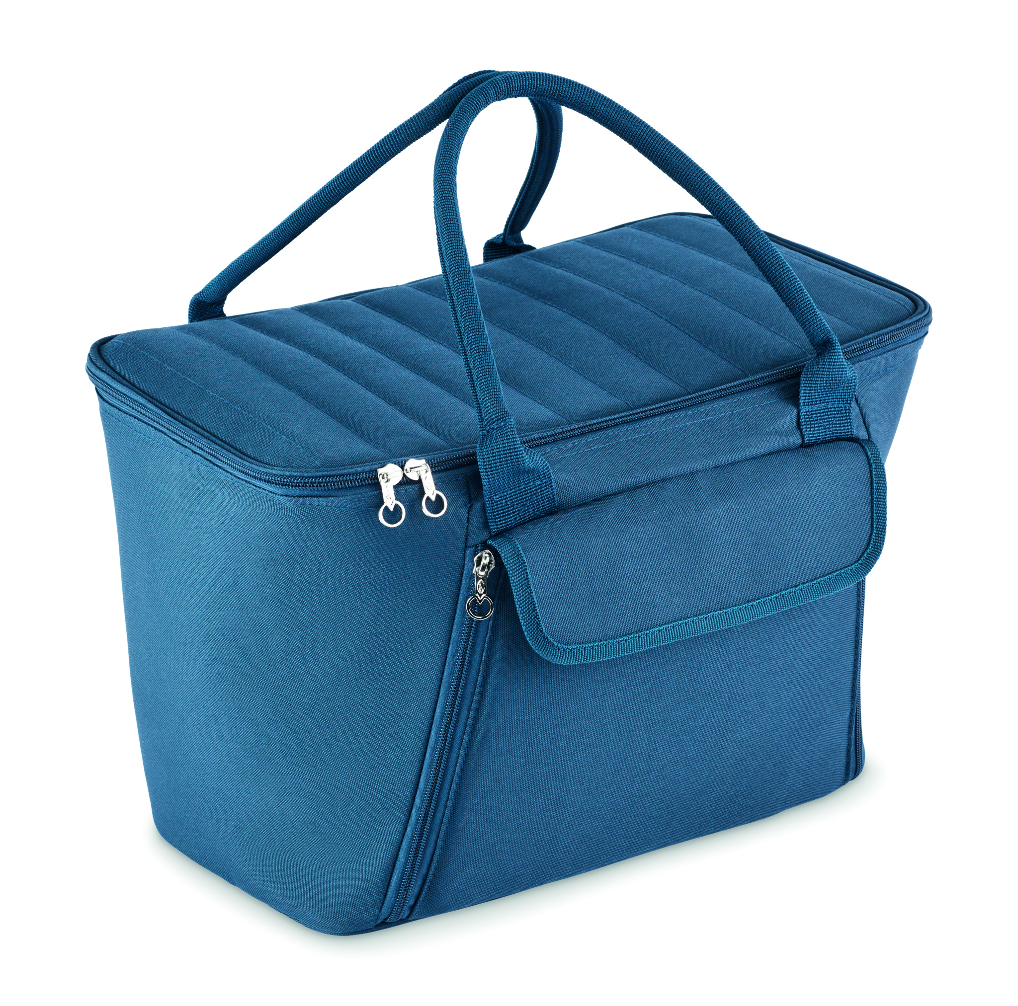 Picnic cooler bag in 600D RPET polyester for 2 people with zippered front pocket including stainless steel cutlery, 2 plates in PS, 2 glasses in PS and 2 cotton napkins. Capacity: 18l