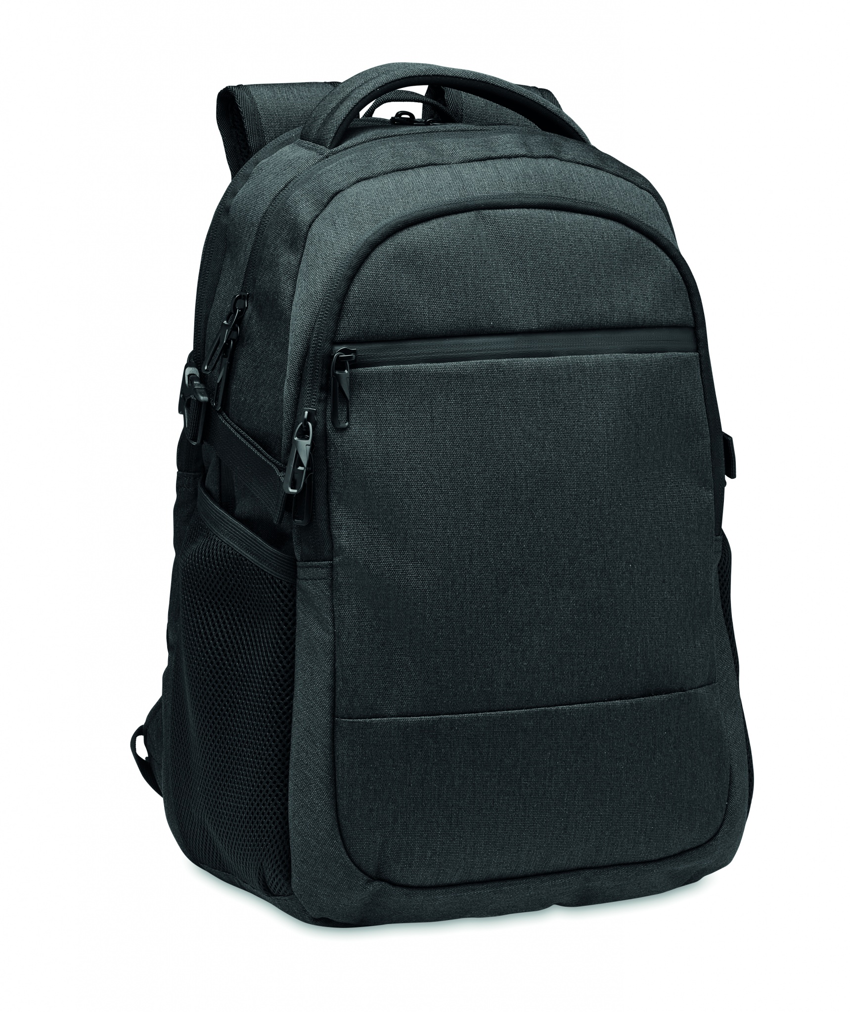 Ryggsäck för bärbar dator 15 tum i 600D RPET polyester. 3 stora yttre fack med dragkedja som är fullt vadderade med flera innerfickor. Den har två sidofickor i nät. Justerbara axelremmar. Vadderad mesh airflow ryggdel. Trolleyhållare på baksidan.