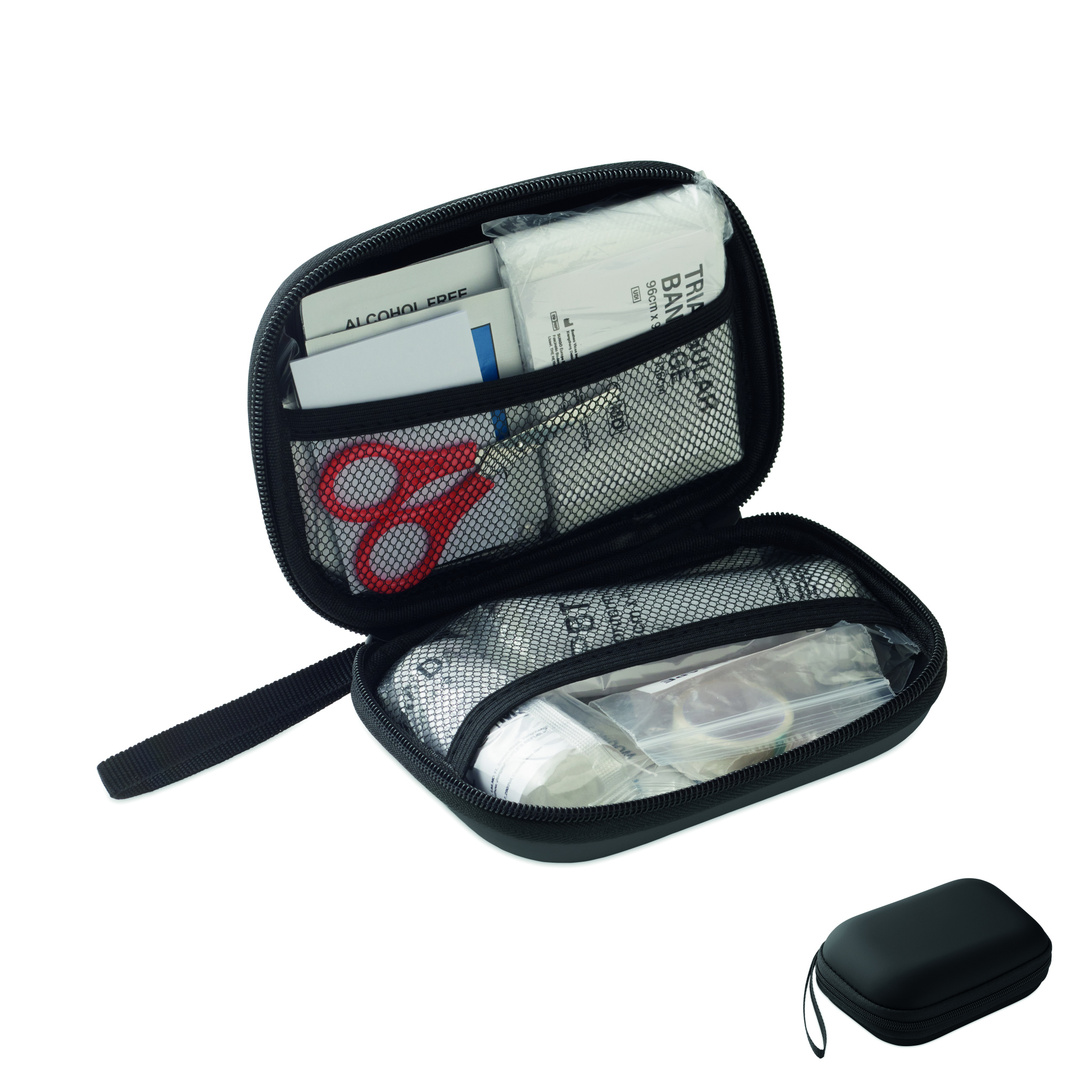 Första hjälpen-kit i hårt PU-fodral. Innehåller 2 handskar, 1 filt, 1 tejp, 2 bandage, 1 sax, 4 tops, 10 plåster och 6 rengöringsservetter. Ej tillgänglig för försäljning utanför EU.
