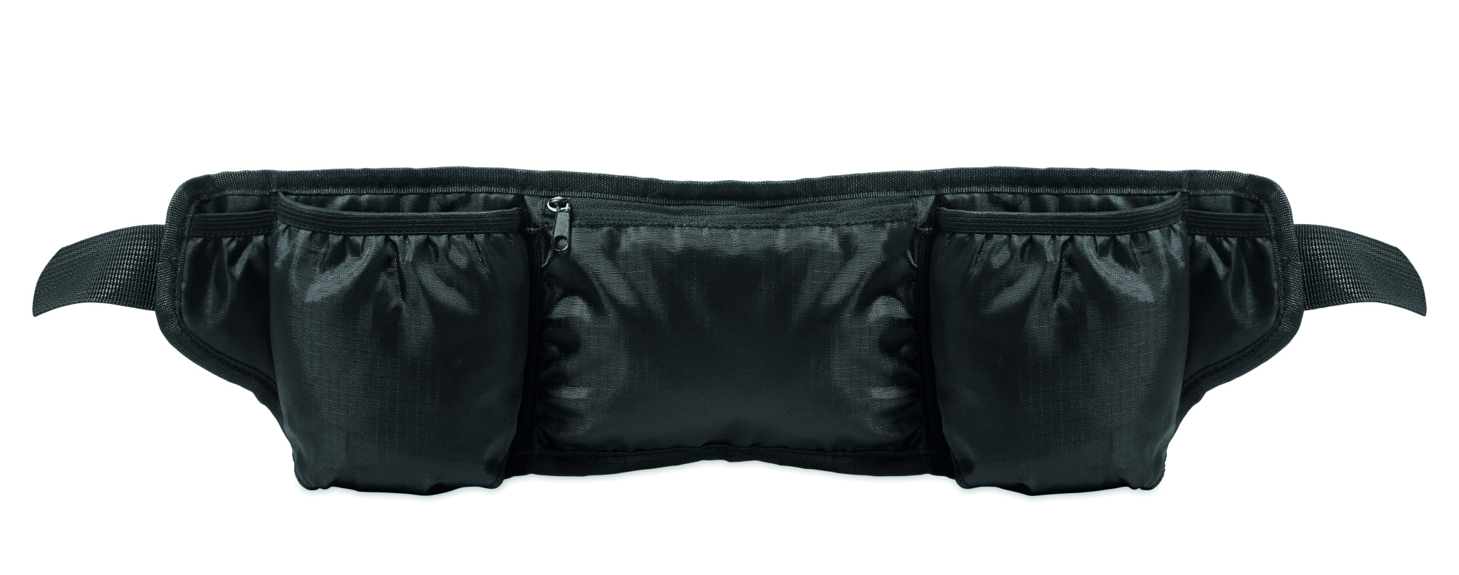 Midjeväska för löpning och vandring tillverkad av 420D RPET-polyester med meshrygg. Två flaskfack, central ficka med dragkedja och justerbar rem. Lätt och slitstark.