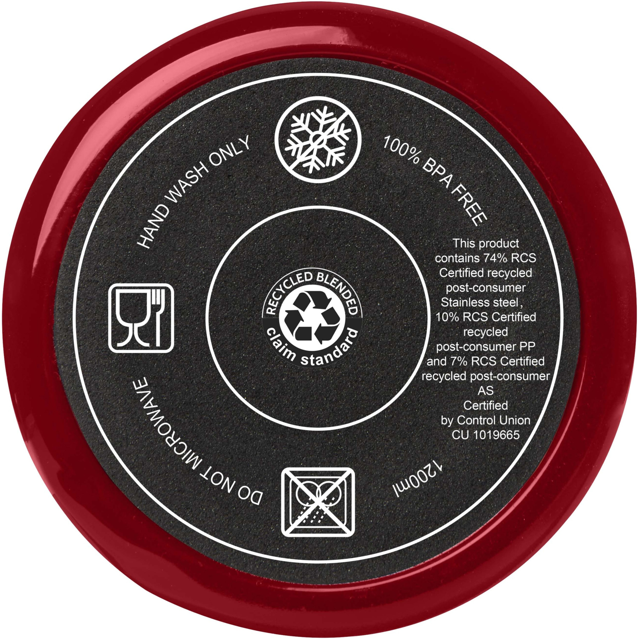 Muggen Melbourne har en hållbar dubbelväggig konstruktion med luftisolering som håller drycker varma i upp till 2 timmar eller 4 timmar för kalla. Muggens innervägg består av återvunnen plast och ytterväggen är tillverkad av RCS-certifierat återvunnet rostfritt stål. Muggen har en kapacitet på 1 200 ml som gör att du kan hålla dig hydrerad hela dagen med stil. Stänksäkert trycklock med två öppningar och vridbar förslutning. Levereras med ett återvunnet sugrör av livsmedelskvalitet. Endast handdisk.