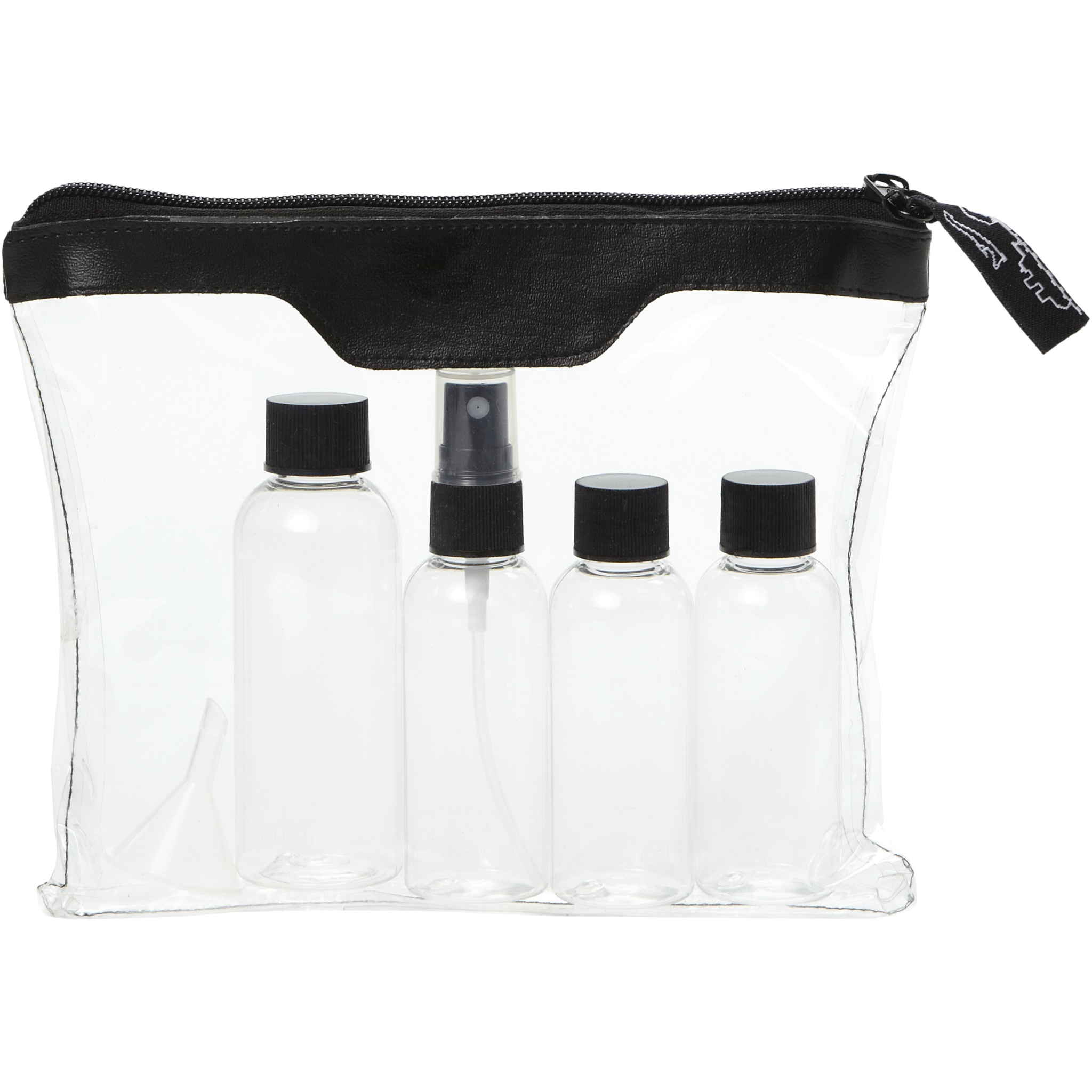 Flygplansnecessär som du kan ta med dig ombord. Innehåller 2 flaskor på 50 ml, 1 flaska på 90 ml och 1 sprejflaska och tratt. Flaskor, sprejflaska och tratt är förpackade i plastpåse, separat från påse. Komponenterna kan inte fås med märkning.