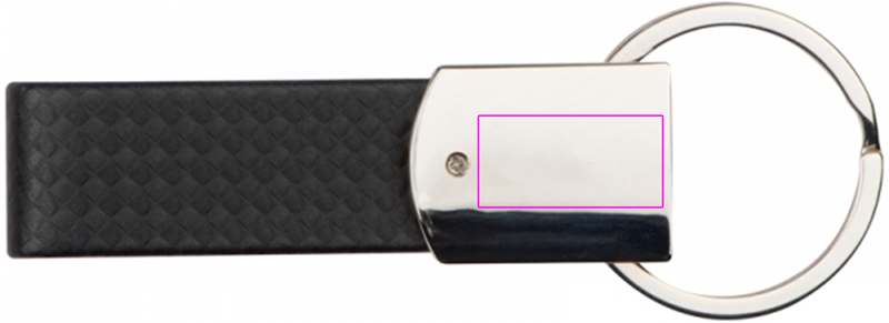 Elegant nyckelring i metall med carbon-look rem. Din logotyp kommer att graveras på den kromade ytan.
