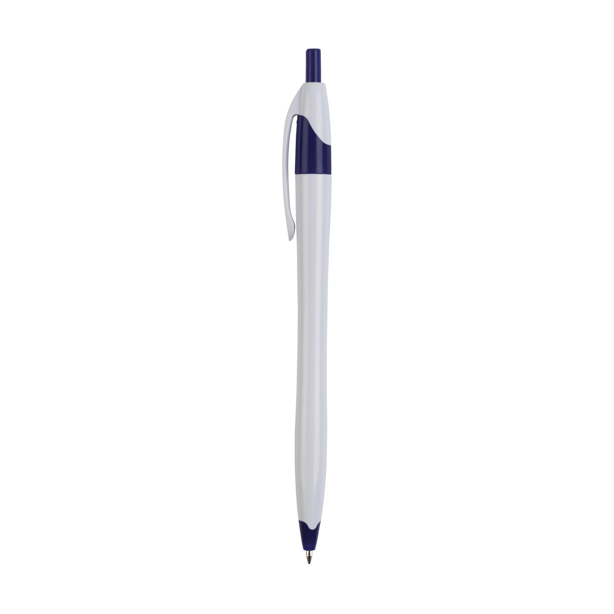 Kulspetspenna med blått bläck med färgade accenter och strömlinjeformad cylinder.