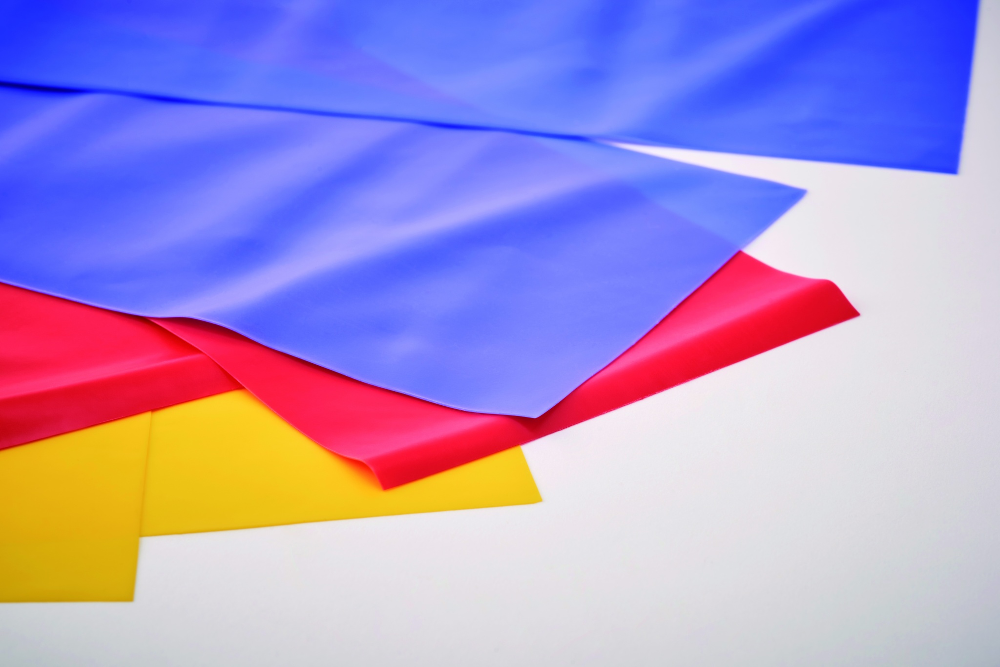 Träningsset med 3 TPE-fitnessband i RPET-polyesterpåse. Fitnessbanden har alla olika styrka för optimal träning.