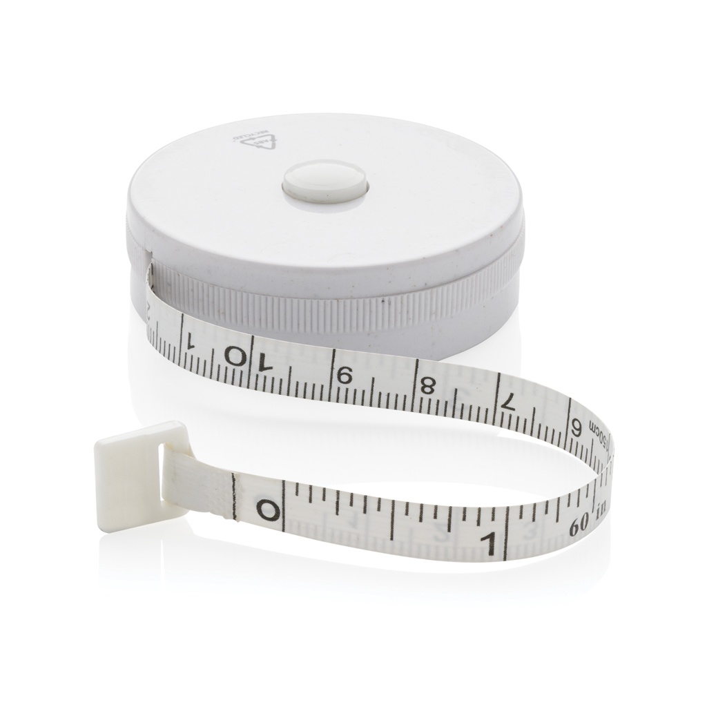 1,5m/60inch återvunnet plastband i återvunnen plast med returtryckknapp, för fitness och mode. Höljet är tillverkat av RCS-certifierad återvunnen ABS-plast, glasfiber och FSC® 100% bambu. Totalt återvunnet innehåll: 64% baserat på total produktvikt. RCS-certifiering garanterar en helt certifierad leveranskedja för de återvunna materialen. Bandet är 8mm brett och kan dras in med hjälp av en knapp. Levereras i FSC®-mixförpackning.