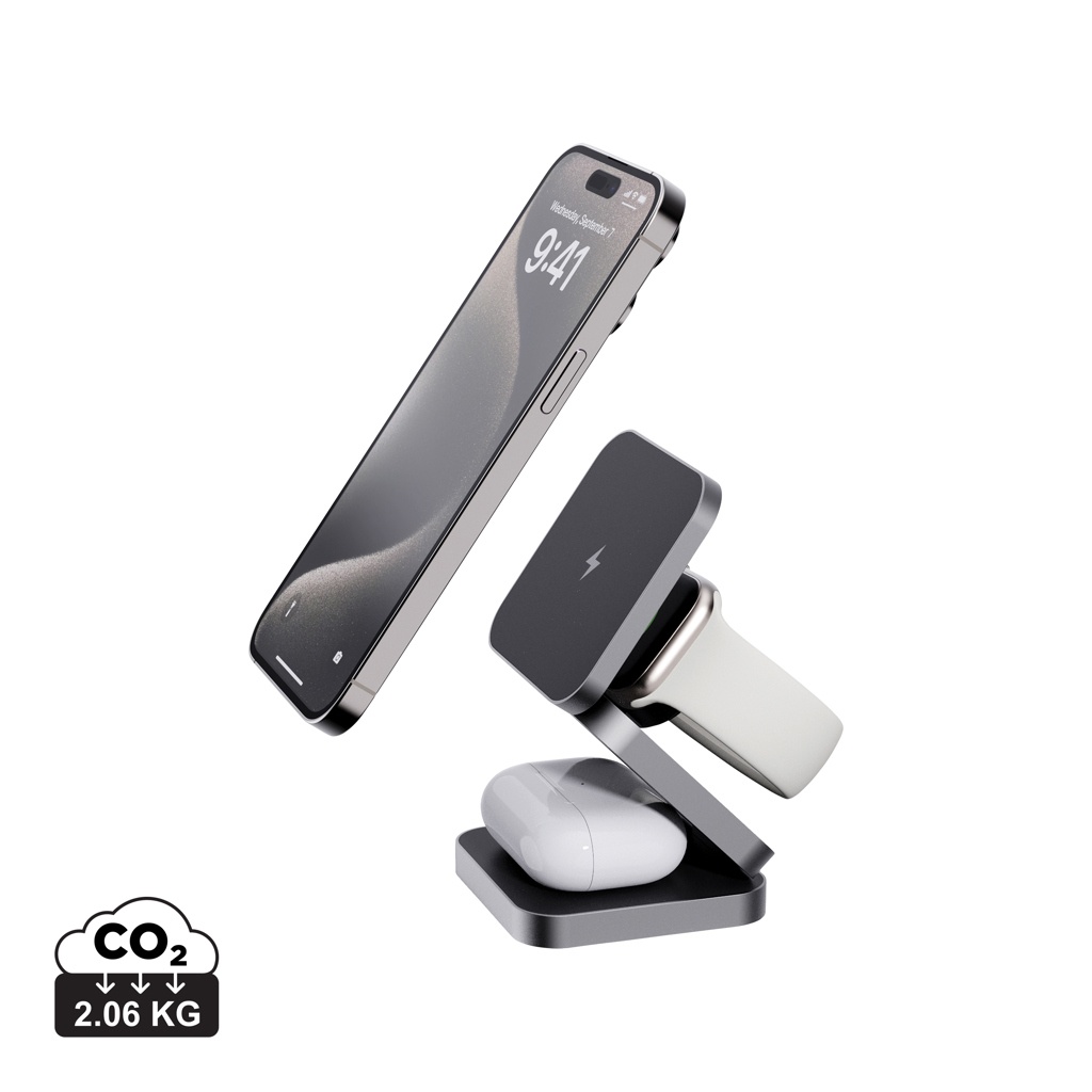 Logotrade reklamprodukter bild: Terra 3 i 1 15W vikbar laddare i RCS återvunnet aluminium