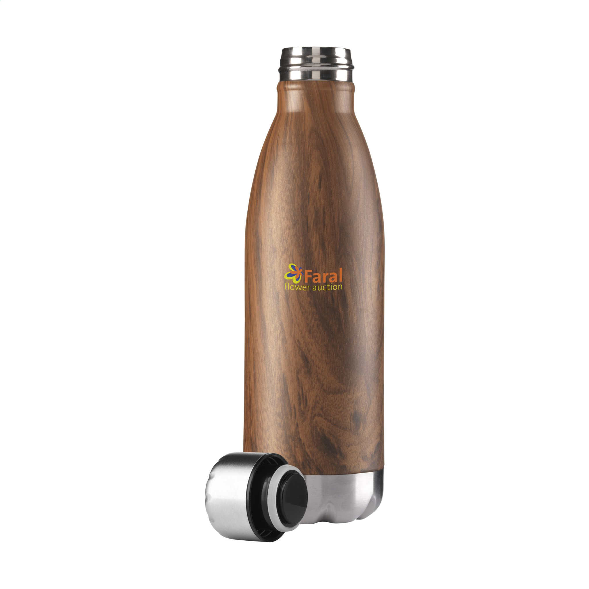 Dubbelväggig, vakuumisolerad vattenflaska i rostfritt stål. Med tät skruvlock. Denna eleganta modell har ett slående, attraktivt toppskikt med ett träfibermönster. Lämplig för att hålla temperaturen på kallt eller varmt vatten. Kapacitet 500 ml. Varje föremål är individuellt förpackad.